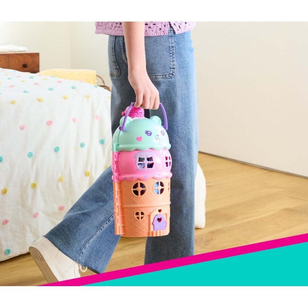 Набор Polly Pocket с плюшевым мишкой выполнен в форме рожка с двумя шариками мороженого, посыпкой и вишенкой на вершине! Так мило! Супер-милый! Очки с мишкой можно использовать как ручку и перемещать набор, чтобы играть, где и когда захочется. Откройте дом и начните вечеринку! Поднимитесь на вилке на самый верх, чтобы увидеть, какой сюрприз ждет вас внутри вишневого дерева. Запускайте конфетти, чтобы зажечь вечеринку! Свободно исследуйте четыре уровня ледяного домика - на каждом из них проходит вечеринка, и все приглашены! Девочкам понравится исследовать больше тематических комнат - от питомника для животных до милой кухни. Поплавайте в бассейне в коттедже или покатайтесь на лошадке-качалке!
