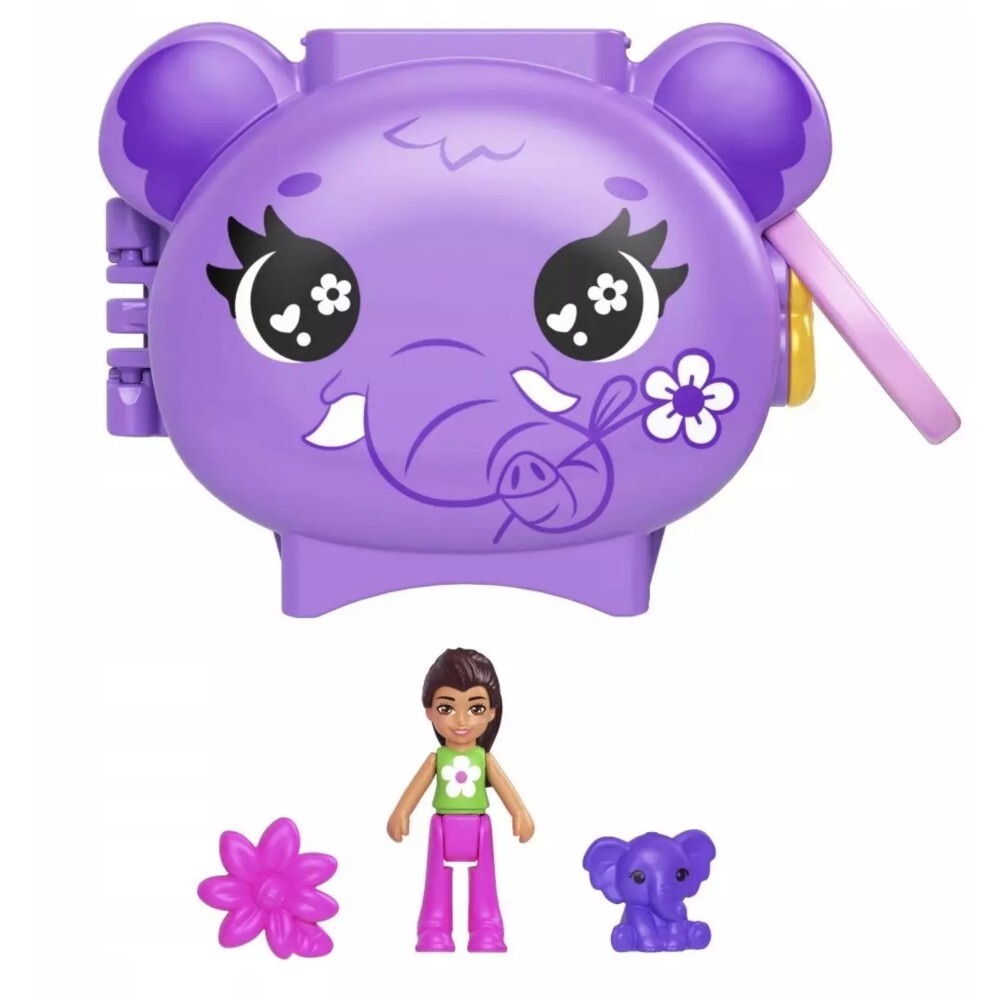 POLLY POCKET Компактный набор "Слон" - это брелок для ключей в форме милого животного. Откройте его и откройте привлекательное игровое пространство в миниатюре! Здесь вы найдете мини-куклу, фиолетового слоника и розовый цветок.