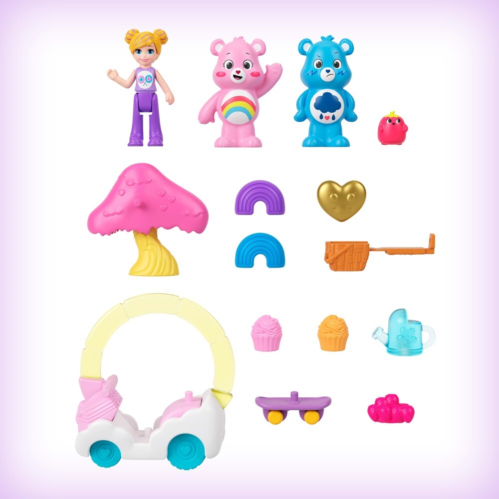 Polly Pocket X Care Bears Caring Bears - это компактный набор, который, открываясь, открывает привлекательное игровое пространство - Страну Заботы, где царят солнечный свет, радуга и безостановочная радость! Здесь детей ждет множество развлечений с мини-куклой Полли, двумя фигурками медвежат и аксессуарами.