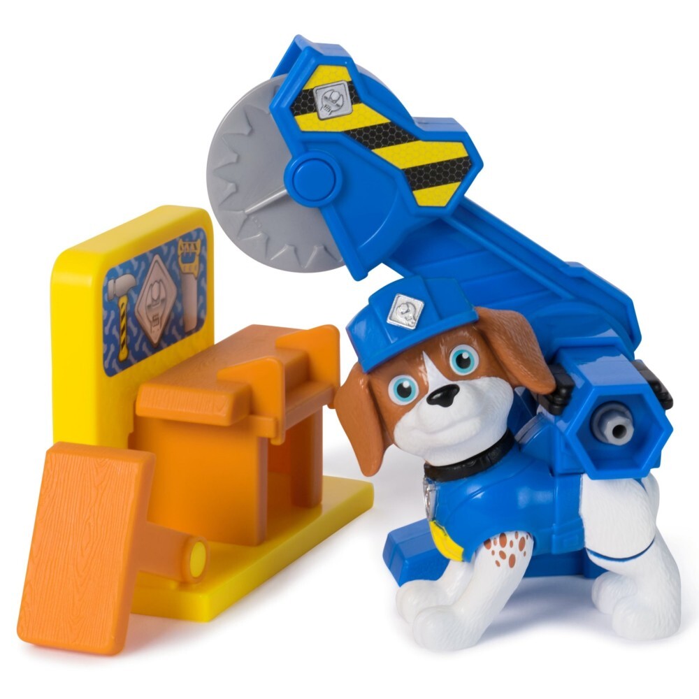 Динамичный собачий дуэт готов к действию. Фигурки поставляются с интерактивными рюкзаками для инструментов - просто нажмите на собаку, чтобы активировать ударную дрель и циркулярную пилу. Щенки знают, что безопасность на стройке имеет первостепенное значение, поэтому они носят каски. С помощью входящих в комплект строительных аксессуаров, таких как предупреждающий знак и стол для резки, дети могут создавать свои собственные сценарии строительства. Поверните ручку, чтобы поднять и опустить предупреждающий знак, затем разрежьте стол пилой, прикрутите и постройте - все ограничивается только вашим воображением!