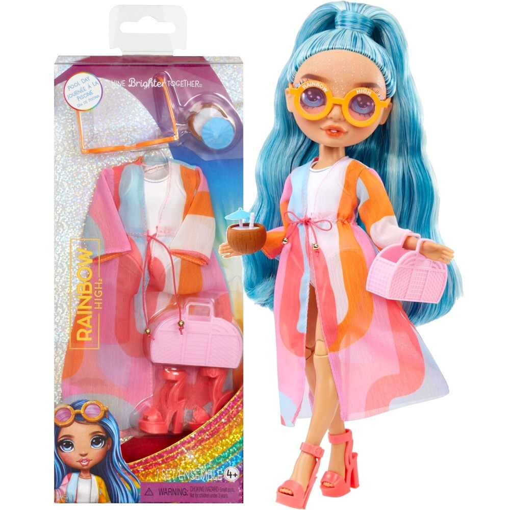 Наряды для кукол Rainbow High - это летний образ, полный красок, свободы и модного шика! Каждая кукла будет готова к отпускным приключениям, отдыху у воды и фотографированию на фоне пальм. Это все, что нужно, чтобы начать сезон отдыха - стильно! В комплект входит цельный купальник, воздушное покрывало, туфли на каблуках, а также солнцезащитные очки, пляжная сумка и пальмовый сок. Это идеальный выбор для жарких дней и еще более жарких модных съемок!