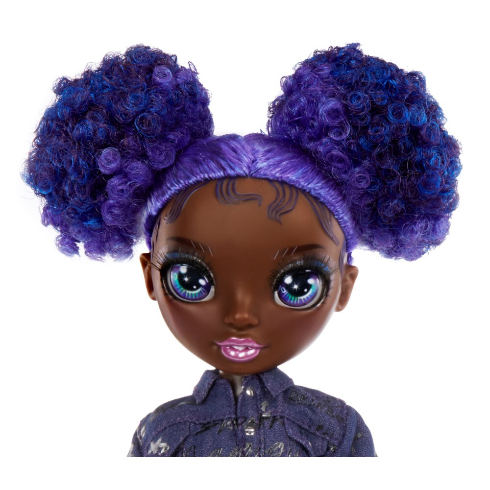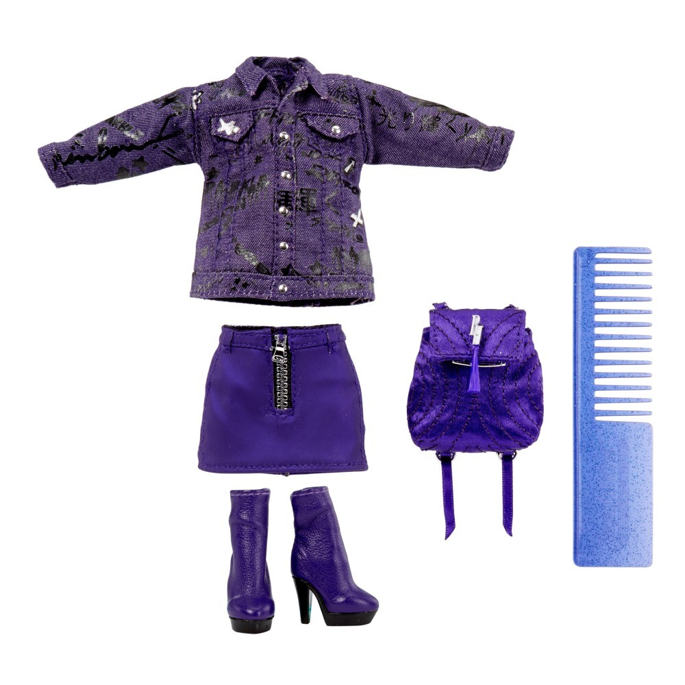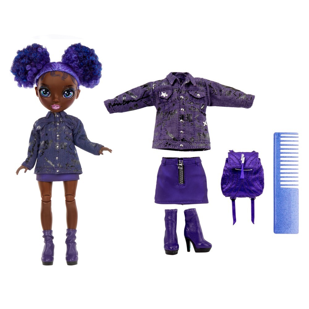 Модная кукла Кристал Бэйли одета в джинсовую куртку с заклепками, фиолетовую юбку на молнии и сапоги в тон. Девочка-подросток никогда не выходит из дома без фиолетового школьного рюкзака.