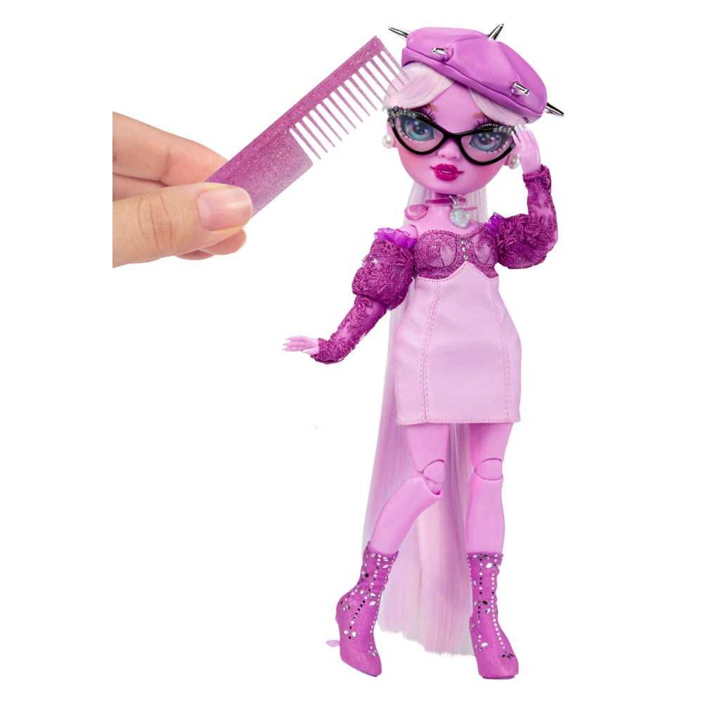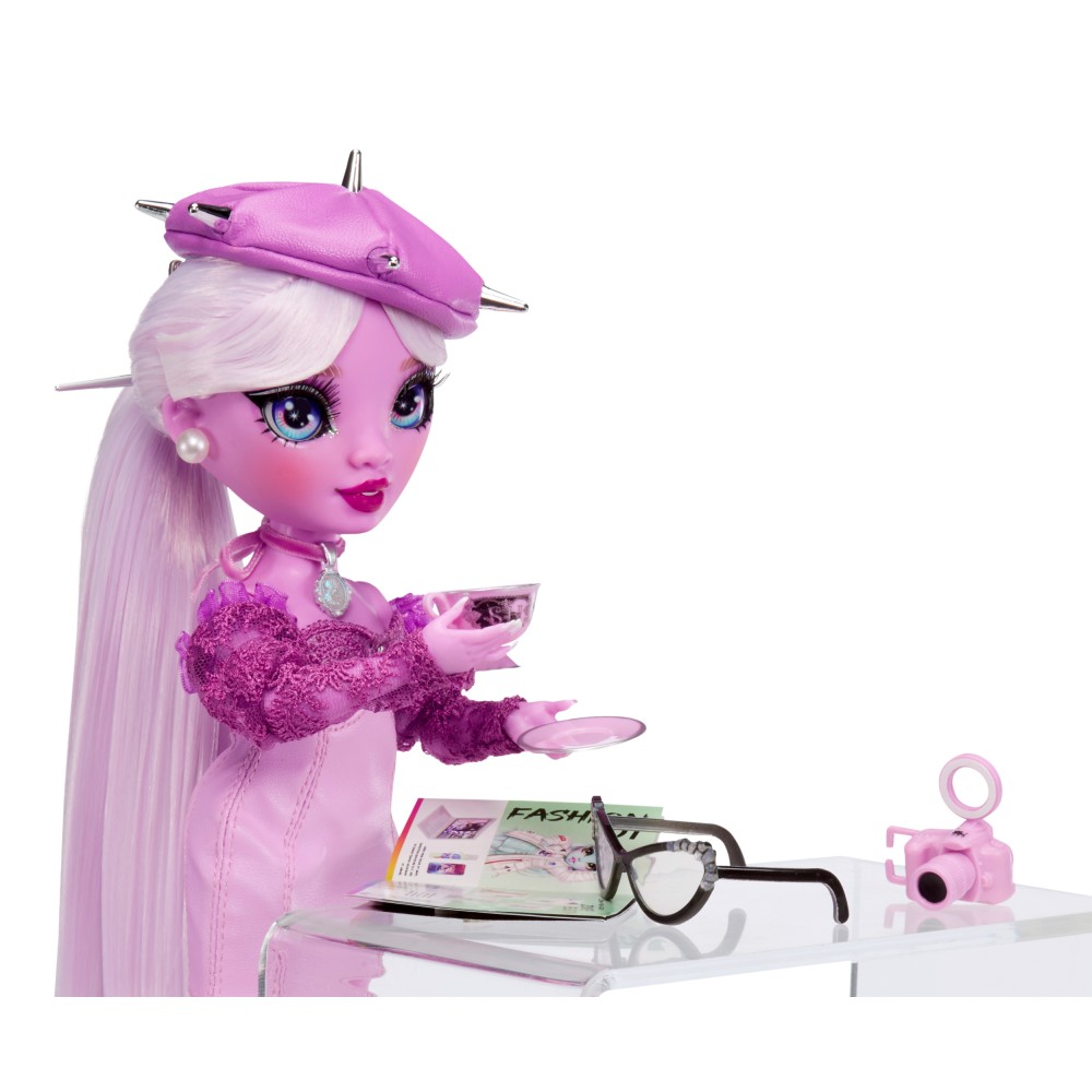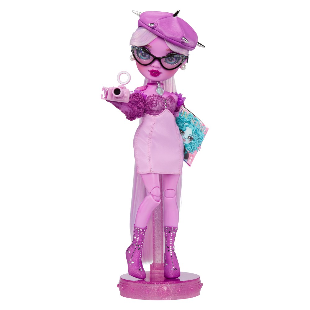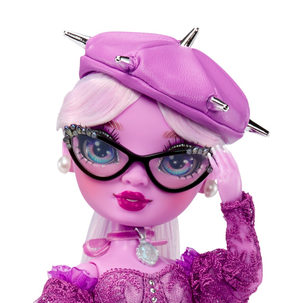 Модная кукла Lavender Lynn ослепляет фиолетовым цветом. Она одета в платье с кружевными деталями, оригинальную беретку и ботинки. Образ дополняет украшение - жемчужные серьги и ожерелье с подвеской. Ее очень длинные волосы зачесаны назад в один хвост. Линн увлекается фотографией и черпает вдохновение из просмотра любимого журнала.