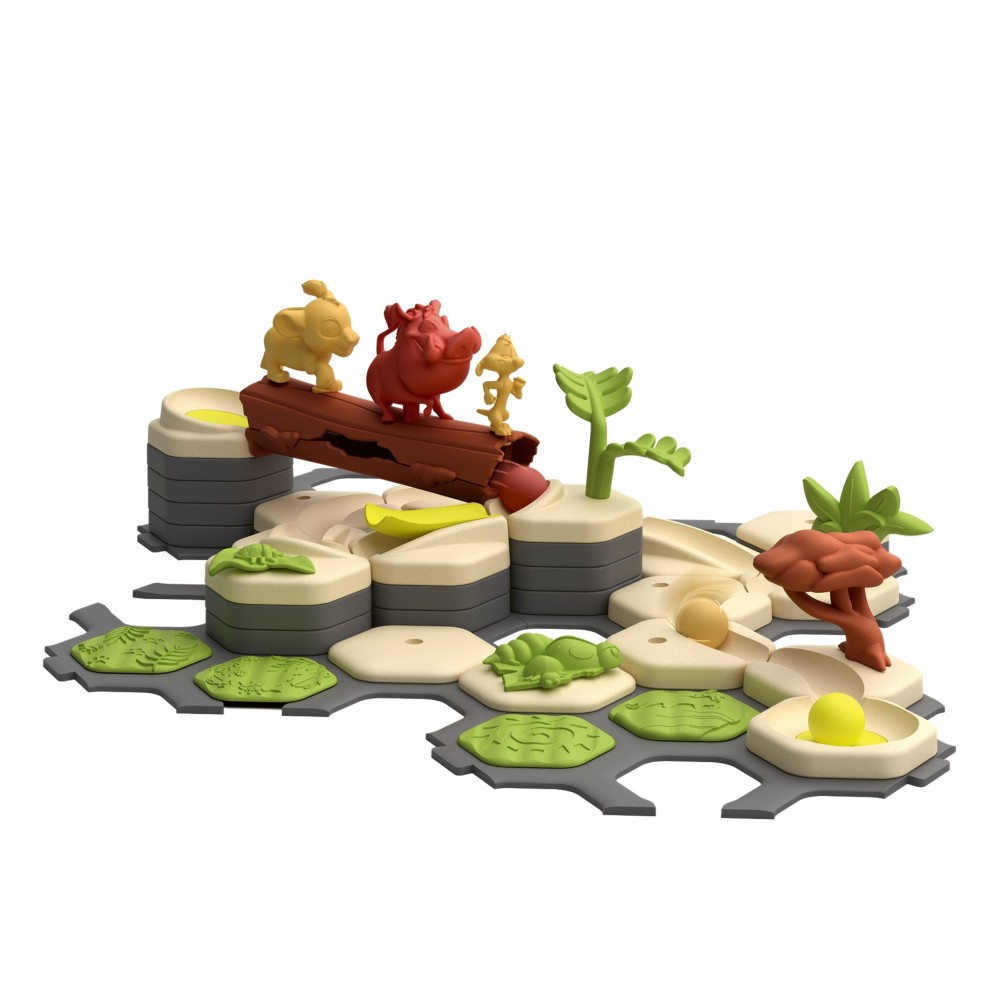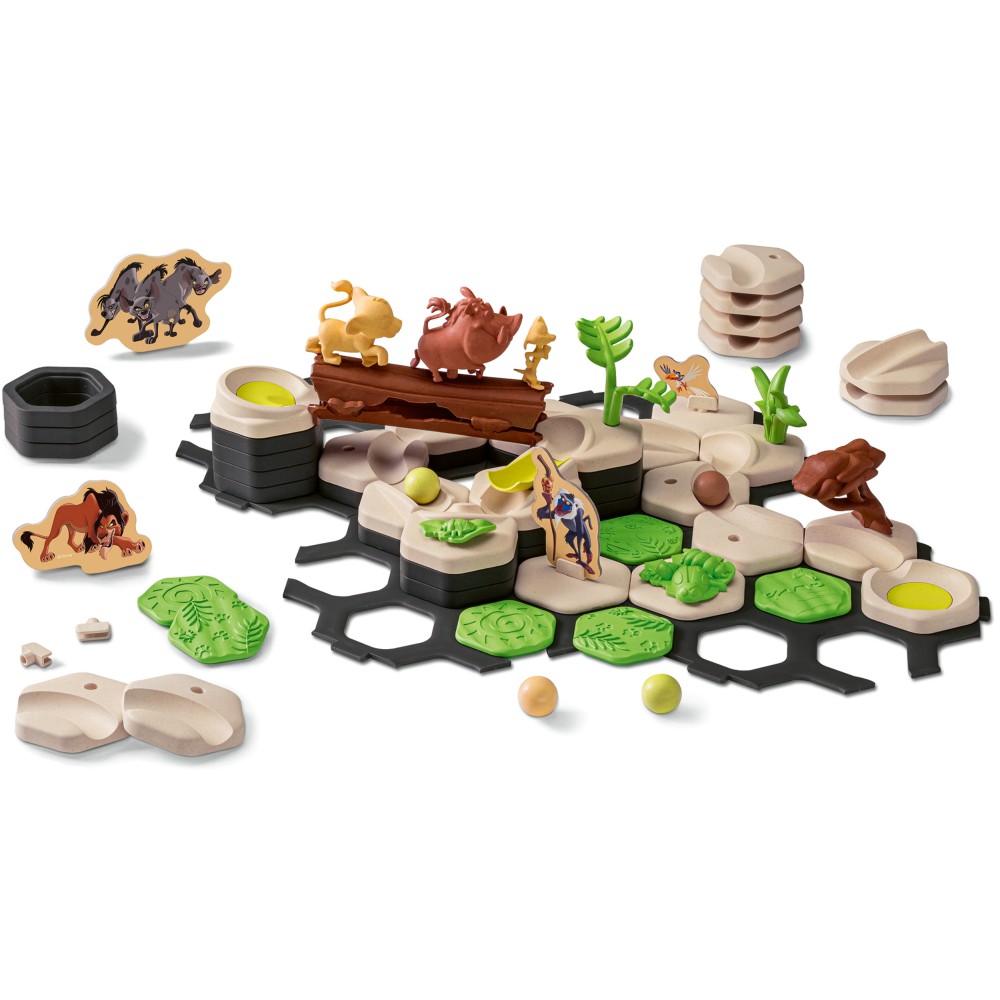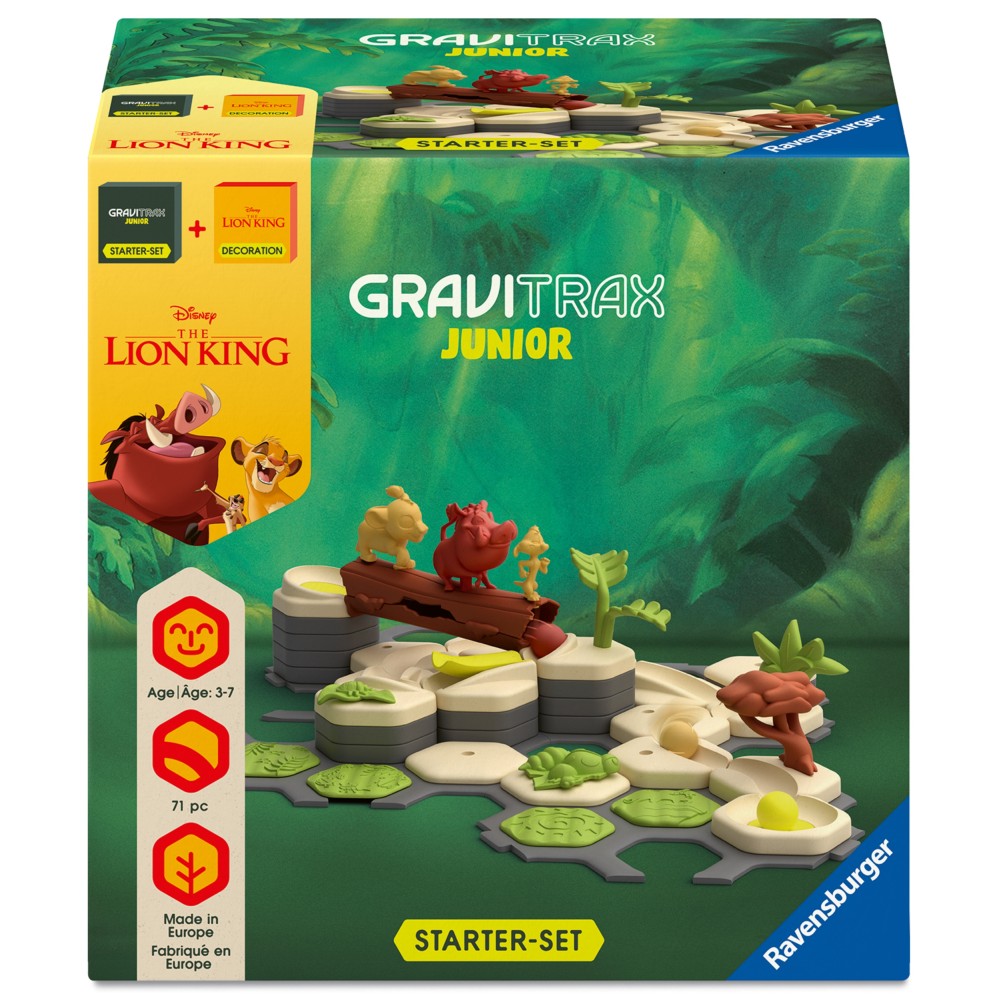 Стартовый набор GraviTrax Junior КОРОЛЬ ЛЕВ содержит все необходимое для построения самостоятельного, полноценного шарового трека, вдохновленного культовым анимационным фильмом Disney "Король Лев". Декорации и компоненты переносят детей прямо на знойную саванну, где каждый трек становится новым приключением в мире Симбы! Стройте свои собственные дороги для шаров, ведите их через различные уровни трека и наблюдайте, как они преодолевают препятствия в окружении, полном атмосферных деталей. Здесь вы найдете зеленые плитки, имитирующие растительность джунглей, трехмерные украшения, а также опавшее дерево, сквозь которое может прокатиться шарик! Но это еще не все - в коробке также есть полноразмерные фигурки Симбы, Тимона и Пумбы, а также картонные изображения гиен, льва Скар, обезьяны Рафики и птицы Зазу. Все элементы вместе создают яркий, полный приключений мир!
