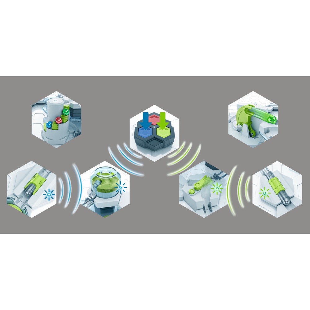 Набор дополнений GraviTrax Power включает в себя восемь аксессуаров, которые соединяются друг с другом по радиосигналу. Этот набор дает еще больше возможностей влиять на трек, чем раньше!