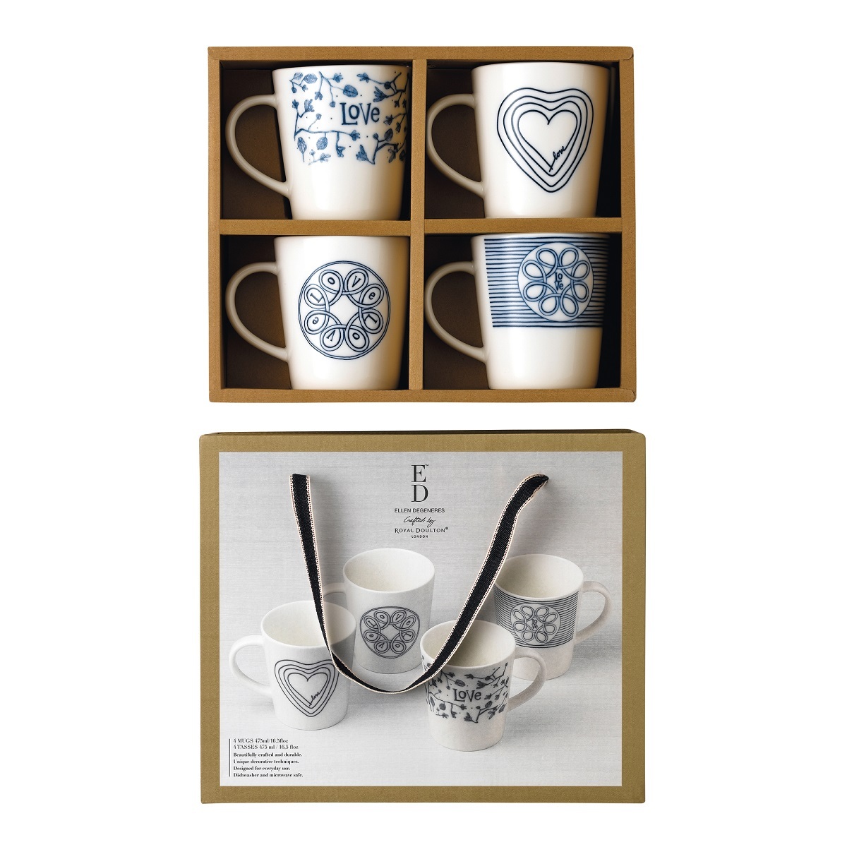 Коллекция Blue Love, в которую входят эти кружки, является выражением веселой и непринужденной философии Эллен ДеДженерес и Ройала Доултона. Для него характерны красивые, ремесленные и нарисованные вручную узоры и природные мотивы. Эти элементы создают неповторимую атмосферу, располагающую наслаждаться мелочами, например, вместе пить кофе или чай.