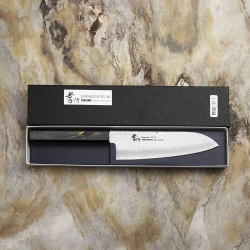 Нож Urushi отличается опущенным кончиком, что значительно облегчает нарезку, и широким лезвием, по которому удобно соскребать нарезанные продукты, чтобы переложить их, например, в салат. Высокая рукоятка обеспечивает комфорт, защищая пальцы от контакта с разделочной доской и продуктами.