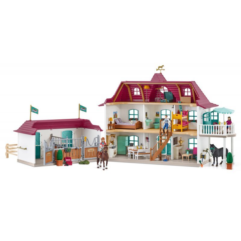 Стилизованный красивый дом с пристроенной конюшней — семейное поместье Крамеров в Лейксайде. Историческая усадьба в белом цвете, с зелеными окнами и дверями, красной крышей и красивым балконом-террасой, впечатляет своим внешним видом. На первом этаже дома находится просторная кухня с оборудованием (плита с духовкой, сушилка для посуды, холодильник, шкаф с мойкой, посуда) и столовая со столом и двумя скамейками. В небольшой гостиной есть место для отдыха на диване и со столом у камина. Старая кривая лестница ведет на второй этаж. У дочерей Крамеров, Ханны и Мии, здесь есть своя комната. Девочки спят на двухъярусной кровати. Из их «царства» можно выйти на просторный балкон с садовой мебелью и зонтиком. На этом же этаже находится ванная комната с душем, туалетом и умывальником, а также спальня родителей с кроватью, тумбочкой и лампой. Интересным местом в доме является старый чердак, скрывающий множество секретов, попасть на который можно по лестнице через люк в потолке. На внешней стене дома, под балконом, есть держатель для садового шланга и балка, к которой можно привязать лошадь во время купания или уборки. Любимый ганноверский жеребец Квартала мистера Крамера и его дочери, Ханны, находится в конюшне с двумя стойлами, расположенной рядом с домом. Набор богато оснащен множеством тематических аксессуаров, а также фигурками, что превращает игру с ним в настоящее приключение.