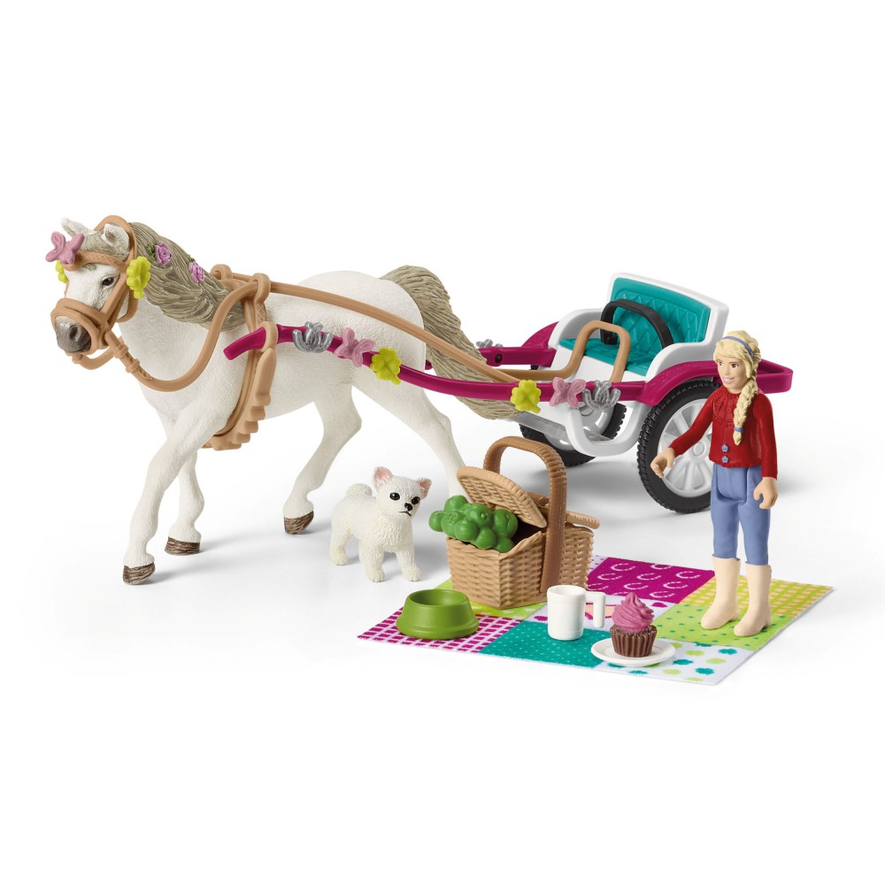 Карета для показа лошадей 42467. София очень взволнована, потому что ее кузина Клара объявила, что сегодня навестит ее. В Лейксайде проходит большое шоу лошадей! Кузина Софии, Клара, приехала в Лейксайд на своей красивой карете, чтобы посмотреть шоу лошадей Schleich Horse Club. Карета для показа лошадей красиво украшена клеверами, подковами и бабочками. Клара также украсила кантар своего пони Коннемара красивыми декоративными элементами. Мягкий пикниковый одеяло и хорошо наполненная корзина для пикника спрятаны на удобной полке. Во время шоу лошадей Клара может удобно сесть на одеяло, прижаться к своему щенку чихуахуа и насладиться пикниковыми угощениями. Клара также взяла маленькую миску для своей милой собачки и свежие яблоки для пони. Декоративные элементы можно комбинировать в любой конфигурации.