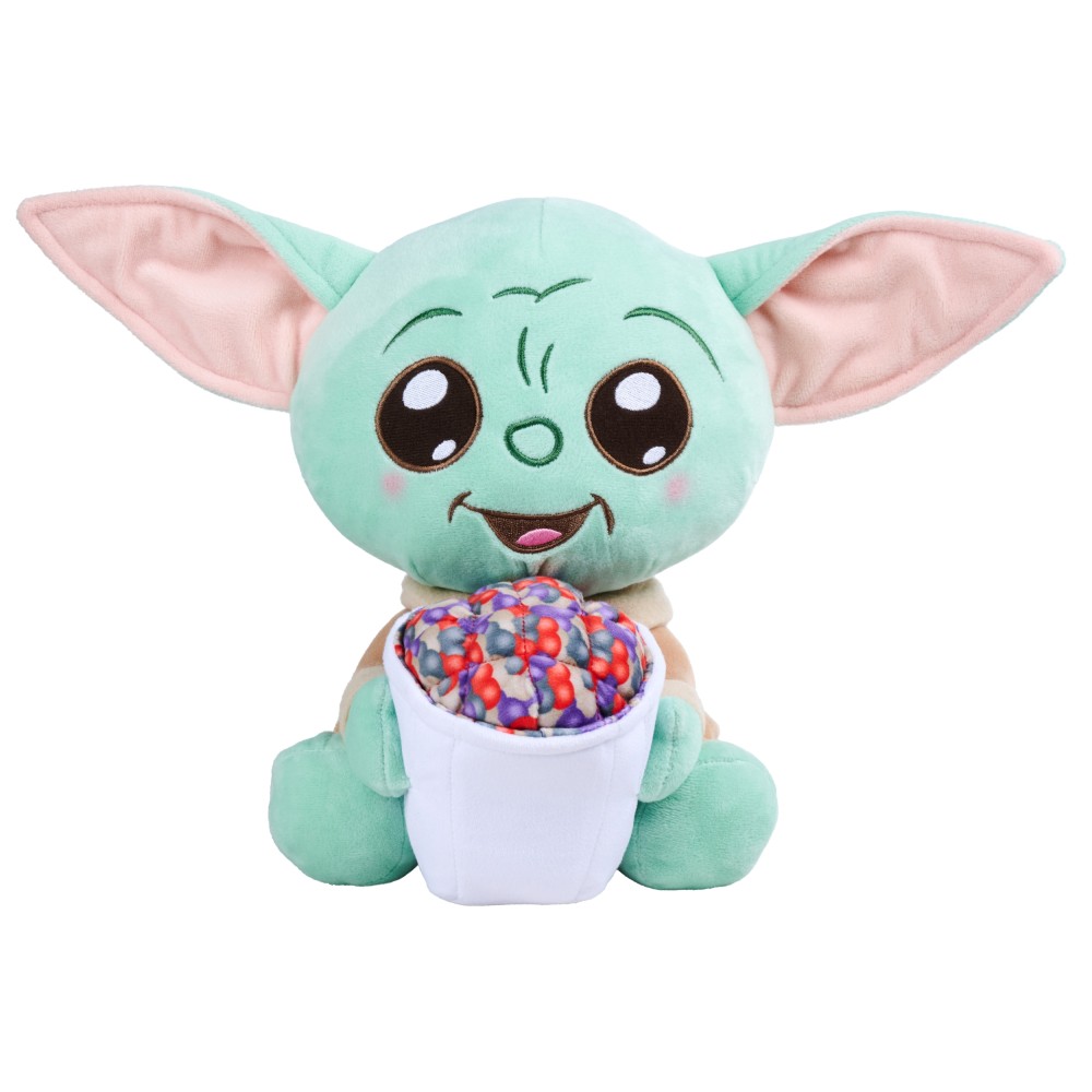 - дружелюбный вид - Грогу держит ведерко с попкорном