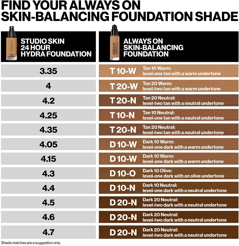 Ссылки на доступные варианты: T20N - LEVEL-TWO TAN WITH A NEUTRAL UNDERTONE T20C - LEVEL-TWO TAN WITH A COOL UNDERTONE T10N - LEVEL-ONE TAN WITH A NEUTRAL UNDERTONE M30N - LEVEL-THREE MEDIUM WITH A NEUTRAL UNDERTONE M20W - LEVEL-TWO MEDIUM WITH A WARM UNDERTONE L30N - LEVEL-THREE LIGHT WITH A NEUTRAL UNDERTONE L20W - LEVEL-TWO LIGHT WITH A WARM UNDERTONE L20 O - LEVEL-TWO LIGHT WITH AN OLIVE UNDERTONE L20N - LEVEL-TWO LIGHT WITH A NEUTRAL UNDERTONE L10W - LEVEL-ONE LIGHT WITH A WARM UNDERTONE L10N - LEVEL-ONE LIGHT WITH A NEUTRAL UNDERTONE F30N - LEVEL-THREE FAIR WITH A NEUTRAL UNDERTONE F20W - LEVEL-TWO FAIR WITH A WARM UNDERTONE F20N - LEVEL-TWO FAIR WITH A NEUTRAL UNDERTONE F20C - LEVEL-TWO FAIR WITH A COOL UNDERTONE D30W - LEVEL-THREE DARK WITH A WARM UNDERTONE F10 O - LEVEL-ONE FAIR WITH AN OLIVE UNDERTONE D20W - LEVEL-TWO DARK WITH A WARM UNDERTONE D20N - LEVEL-TWO DARK WITH A NEUTRAL UNDERTONE D10W - LEVEL-ONE DARK WITH A WARM UNDERTONE D10N - LEVEL-ONE DARK WITH A NEUTRAL UNDERTONE F10N - LEVEL-ONE FAIR WITH A NEUTRAL UNDERTONE