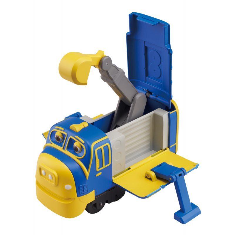 - Претерпевает трансформацию - открывающаяся крыша паровоза и выдвигающиеся вручную боковые панели игрушки.