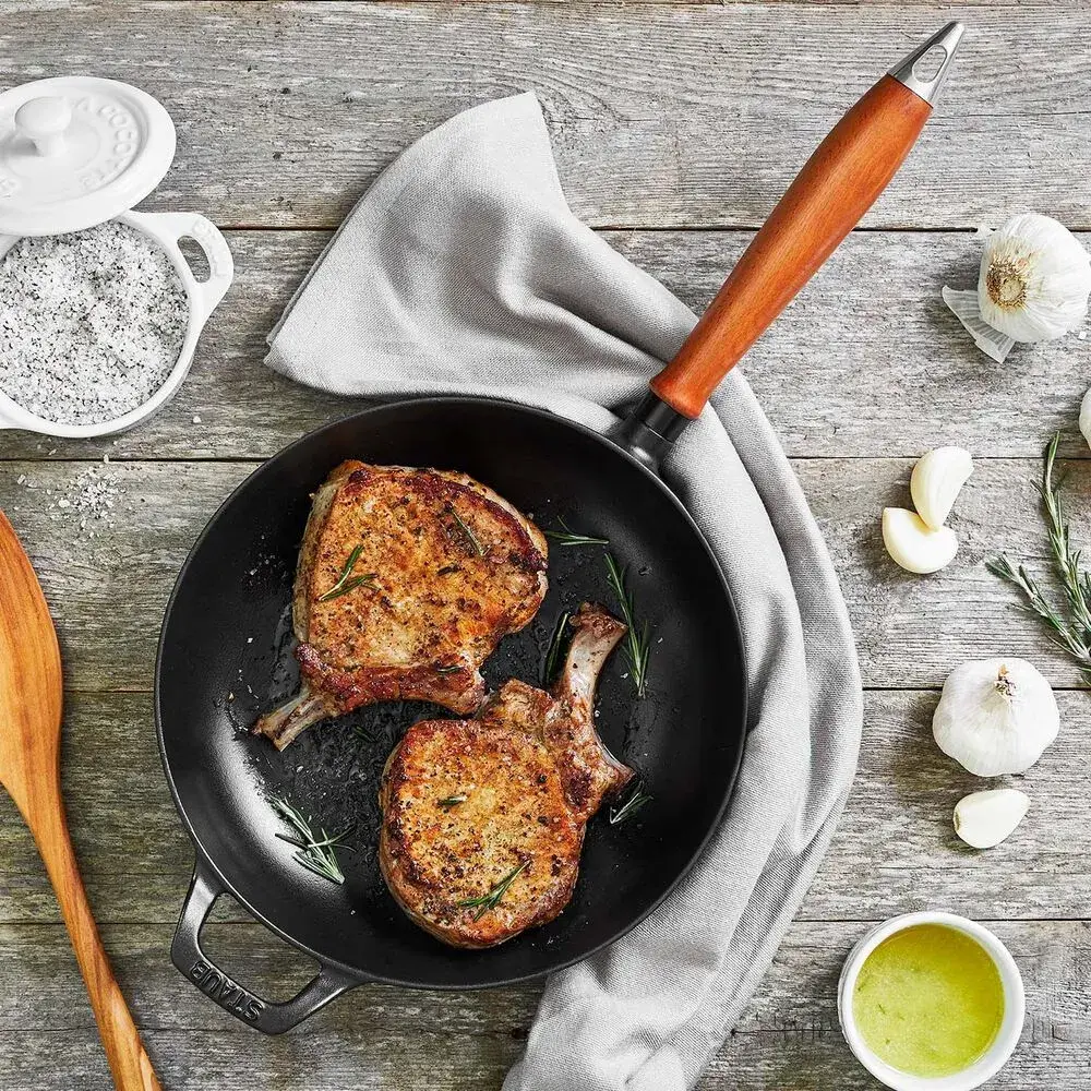 Идеально подходит для жарки и запекания мяса и овощей – подчеркивает глубину вкуса, создает румяную, карамелизированную поверхность, не лишая при этом блюда сочности. Он оснащен деревянной ручкой, которая не нагревается, что позволяет перемещать посудину в любой момент во время приготовления. Кроме того, в сочетании с черным чугуном темное дерево придает сковороде неповторимый вид.
