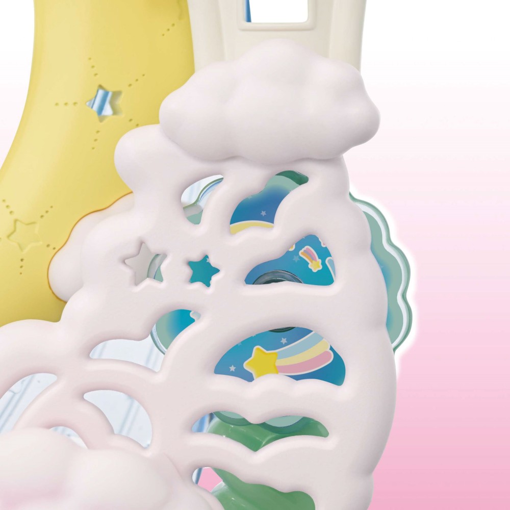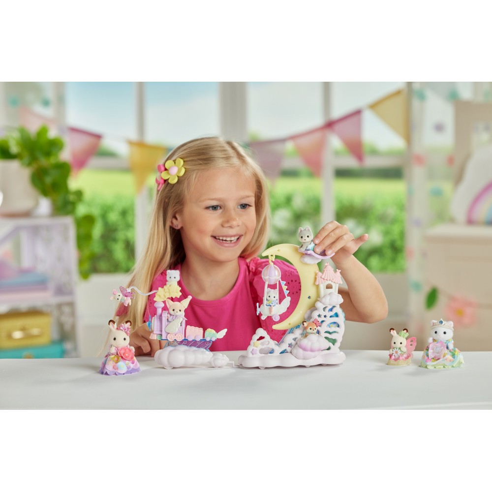 Парад в облаках только начался! Волшебное транспортное средство в форме летающего паровозика тащит за собой платформу с огромной луной. Во время поездки луна нежно качается, что приводит в движение воздушный шарик-самолетик. В комплекте очаровательная фигурка котенка из семьи Латте. Она покрыта светлым, бархатистым мехом и одета в костюм падающей звезды. Маленькая кошечка удобно сидит в самолетике, когда парад преодолевает дороги страны Sylvanian.
