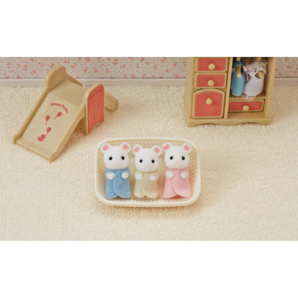 Тройня пенных мышек - самые милые малыши Sylvanian! У них белые бархатистые шерстки, черные глазки как угольки и прекрасные ушки с розовыми сердечками. Братья и сестры спят в удобной плетеной корзинке, ждут, когда их позаботятся!