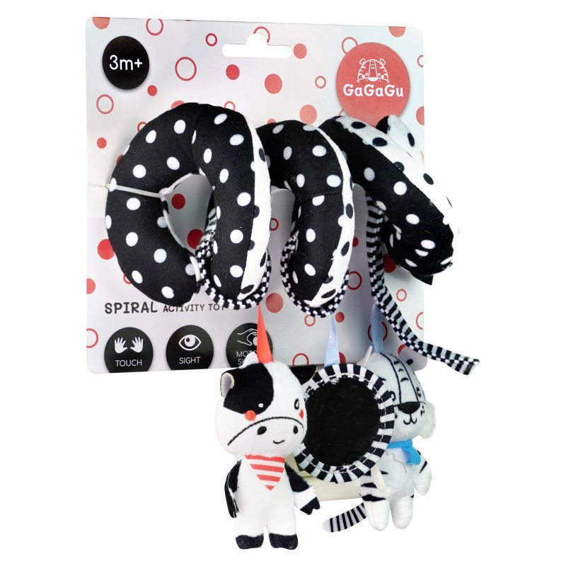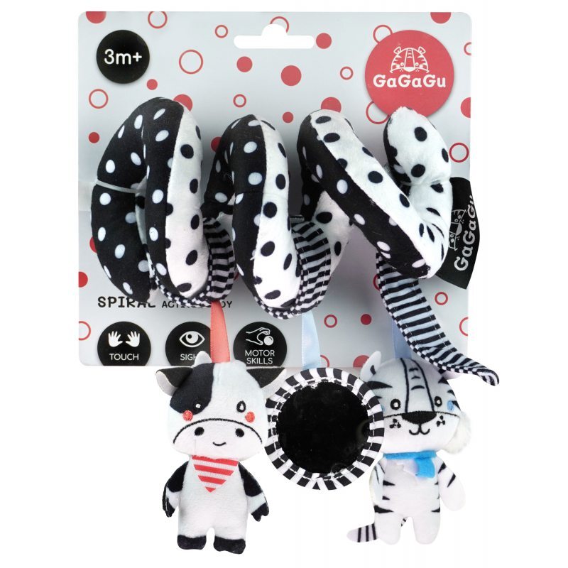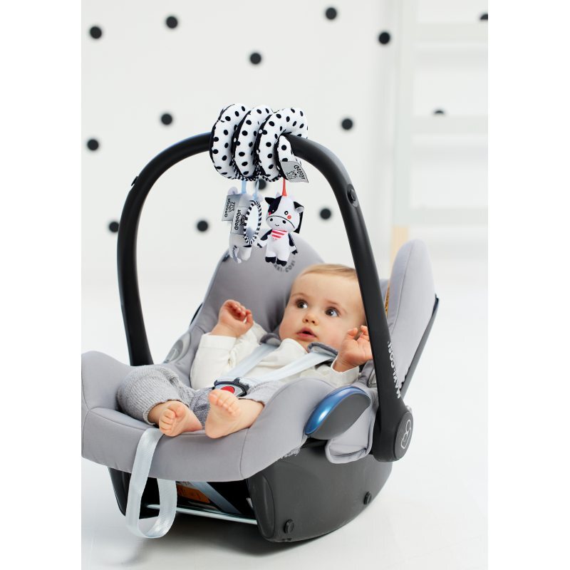 Плюшевая спираль с подвесками Tiger Cow - игрушка контрастных цветов, стимулирующая зрение малыша. Плюшевые элементы побуждают ребенка к хватанию, что развивает так называемую мелкая моторика, т. е. движения пальцев и рук.