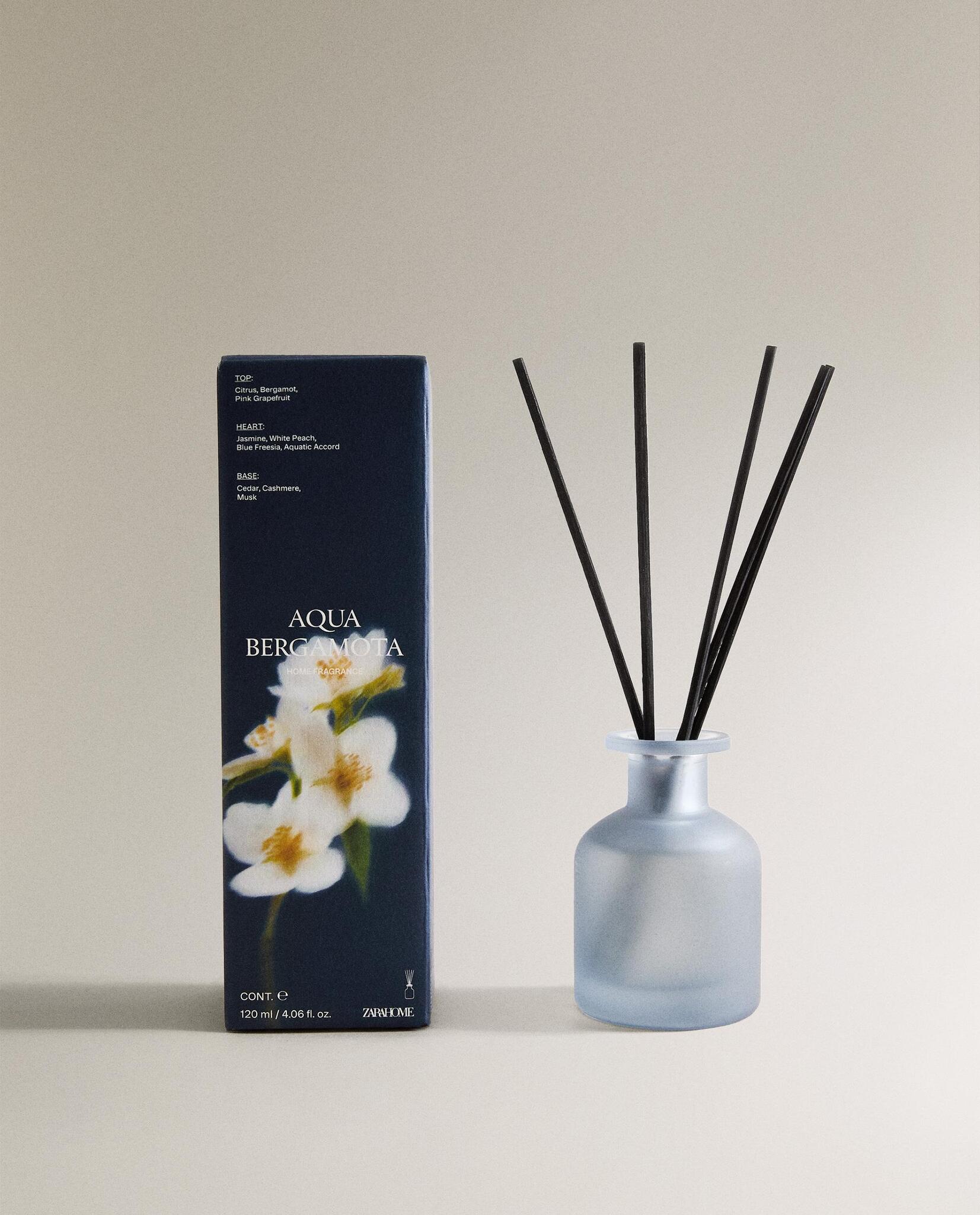 Ароматический диффузор с тростниковыми палочками Zara Home Aqua Bergamota создан для равномерного ароматизирования любого пространства. Этот свежий аромат перенесет вас на берега Средиземного моря. Он вдохновляет своими нотами бергамота и розового грейпфрута, нежно смешанными с кремовостью белого персика и деликатным цветочным букетом жасмина и голубой фрезии на древесном фоне, легко округленным кашемиром и белым мускусом.