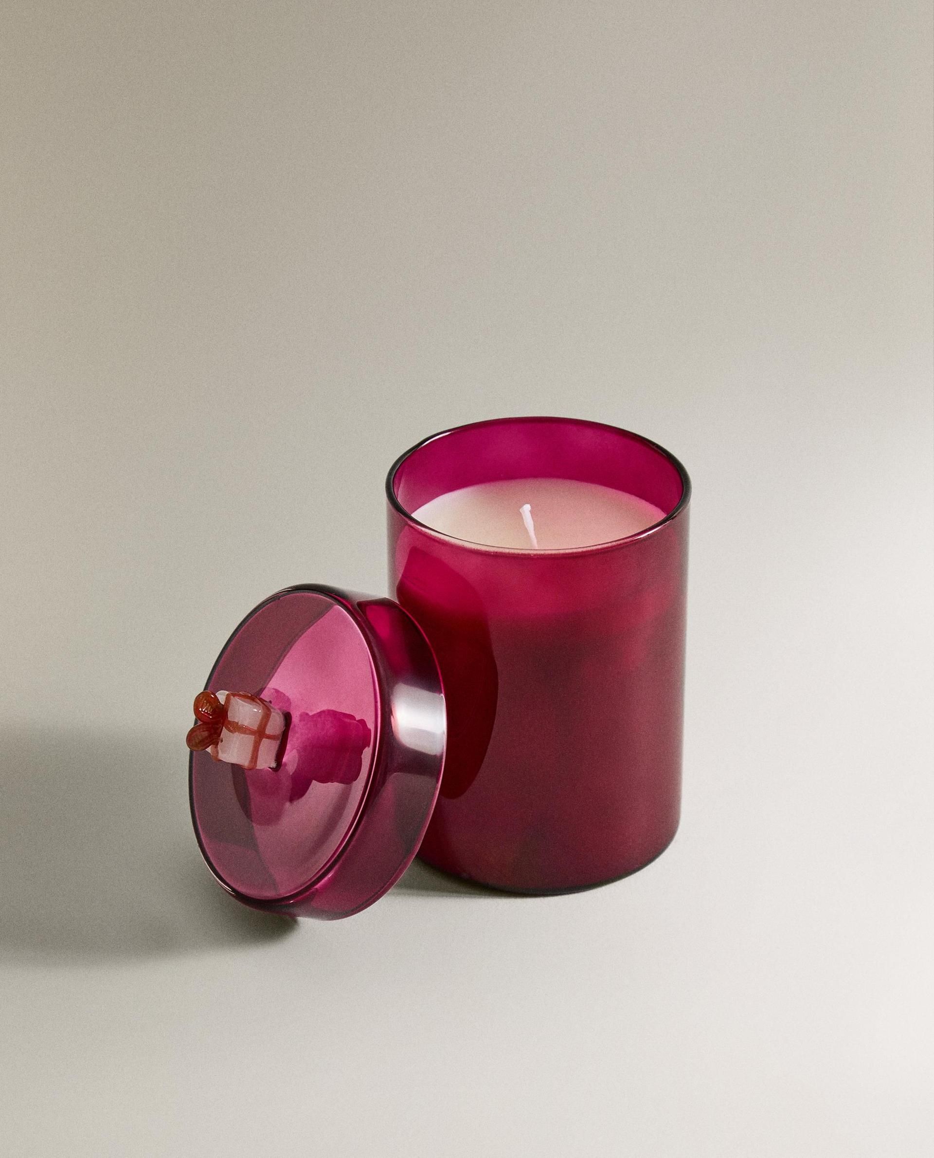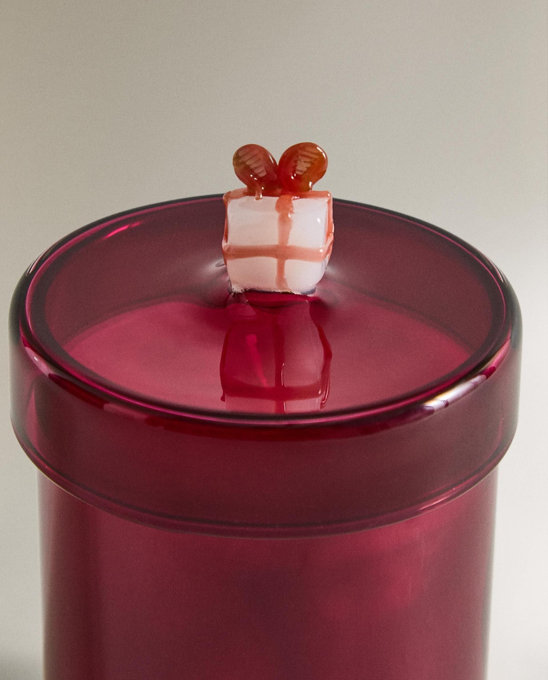 Ароматическая свеча из растительных восков с праздничной деталью из боросиликатного стекла на крышке.