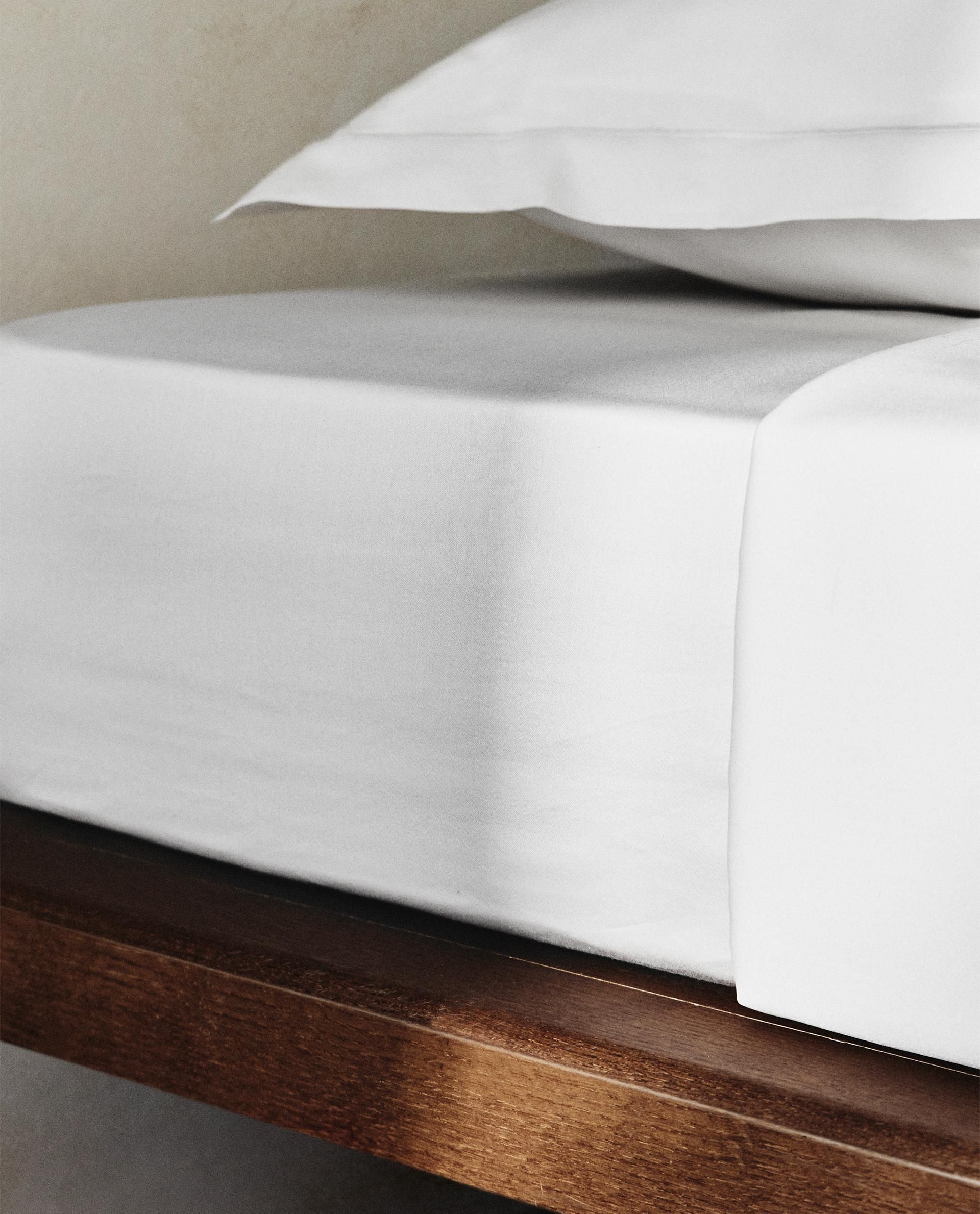 Гладкая простыня с эластичной атласной лентой на 300 нитей. Для матраса высотой 40 см.