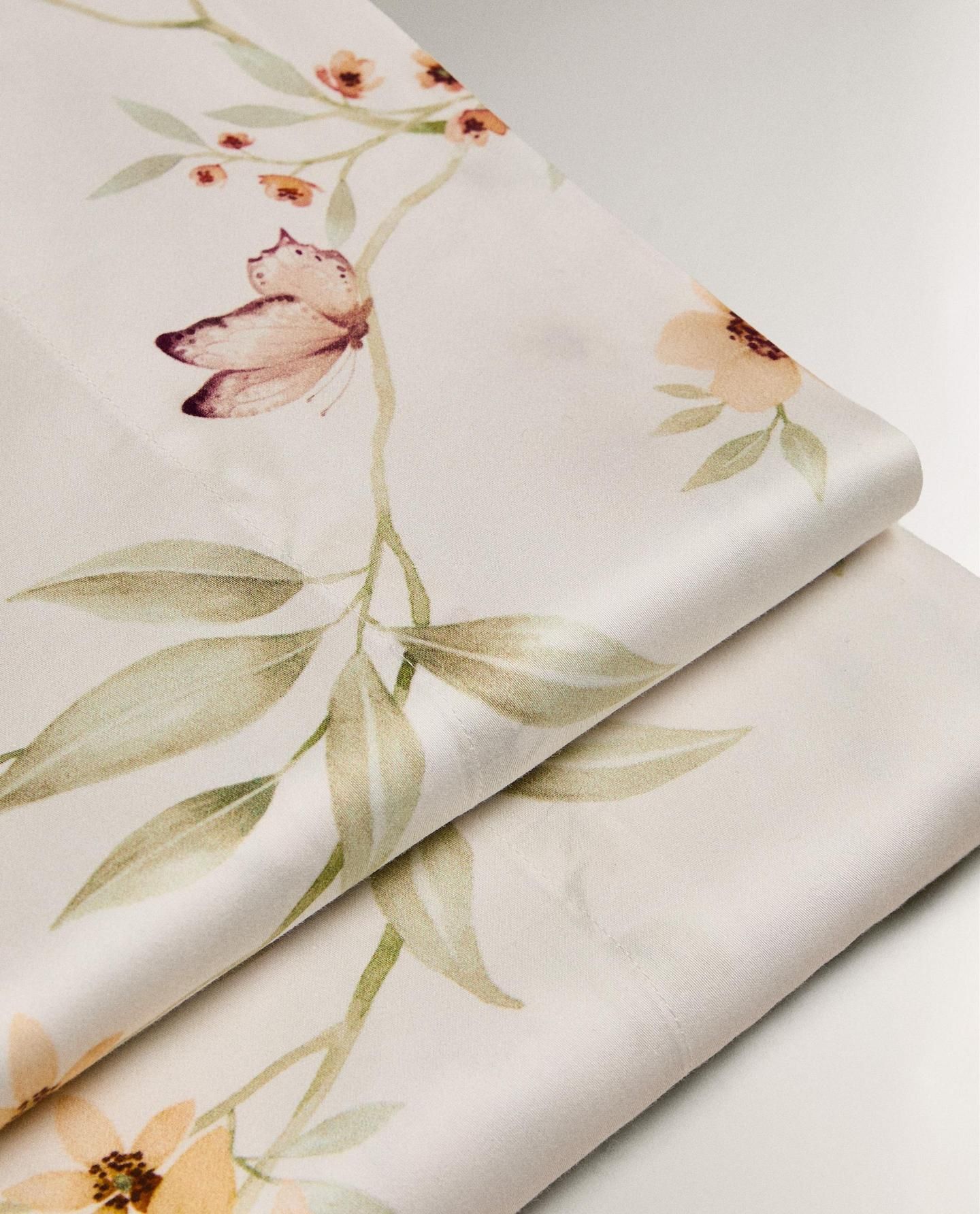 Простыня из хлопкового атласа 300 нитей с принтом цветов и бабочек.