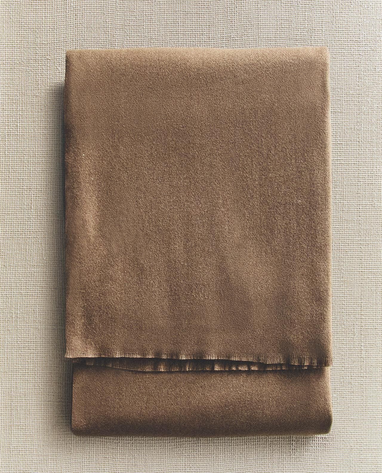 Гладкое мягкое на ощупь одеяло с бахромой на концах.