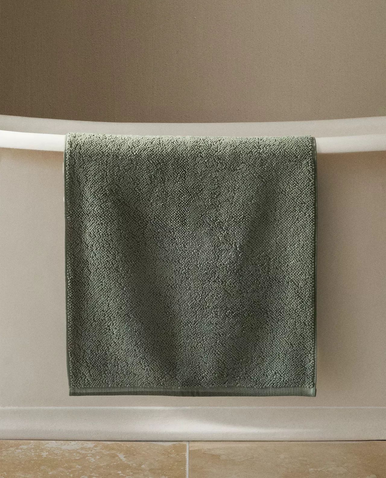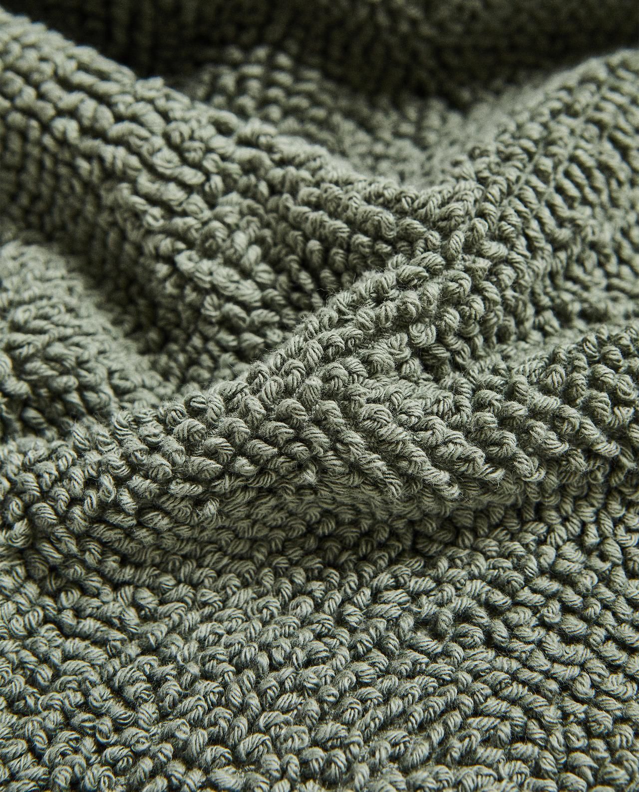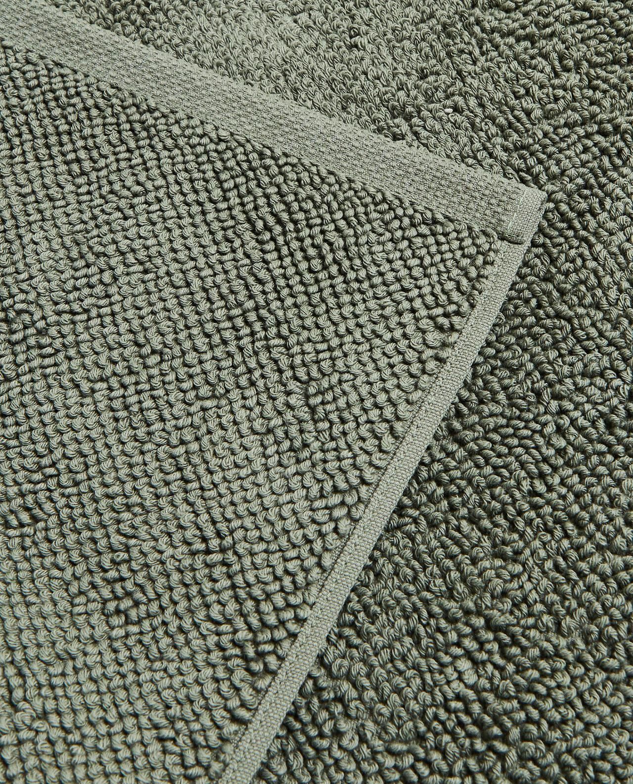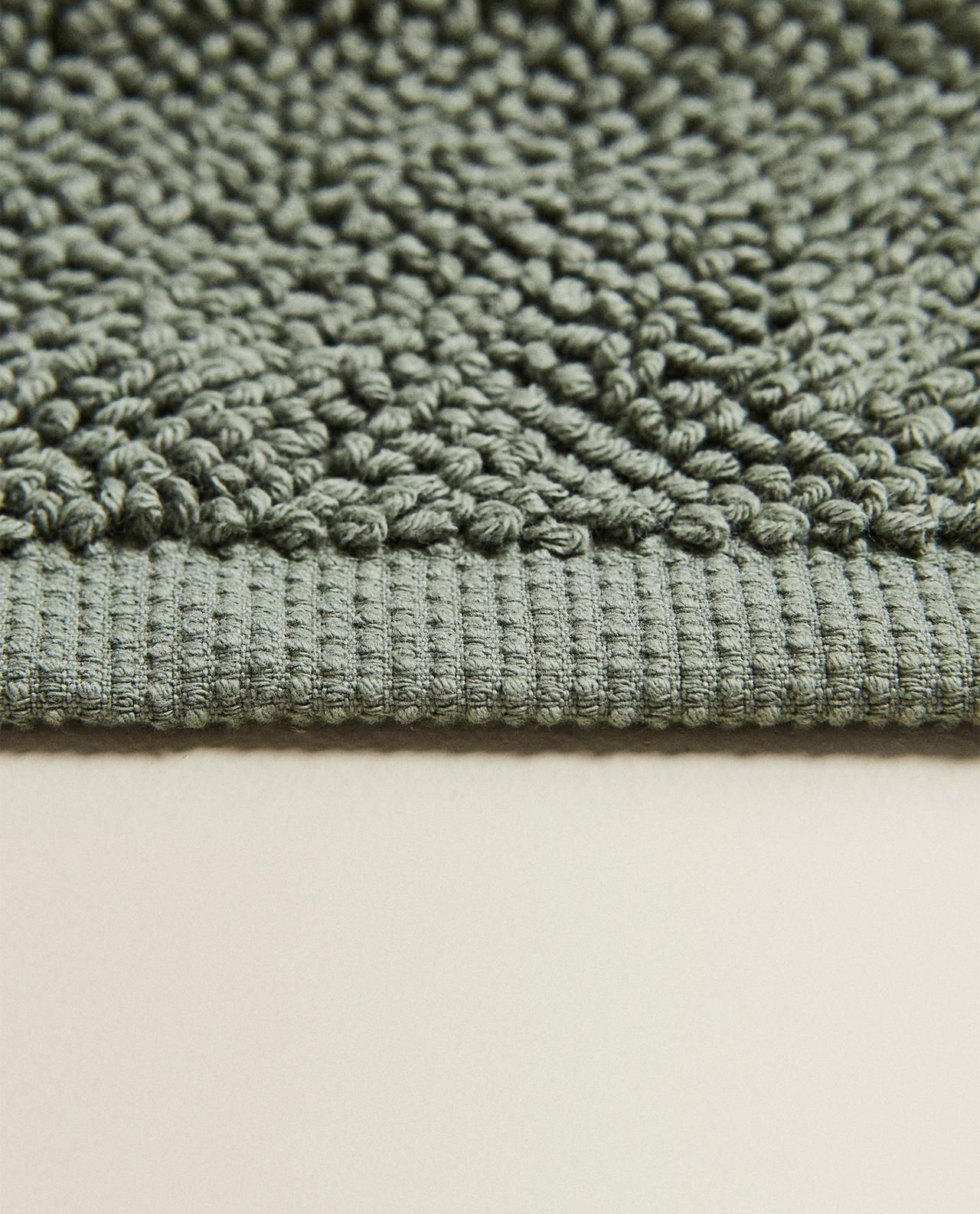 Прямоугольный хлопковый коврик для ванны с густой и впитывающей текстурой. Дно имеет нескользящее покрытие, которое обеспечивает устойчивость и предотвращает скольжение на мокрых полах.