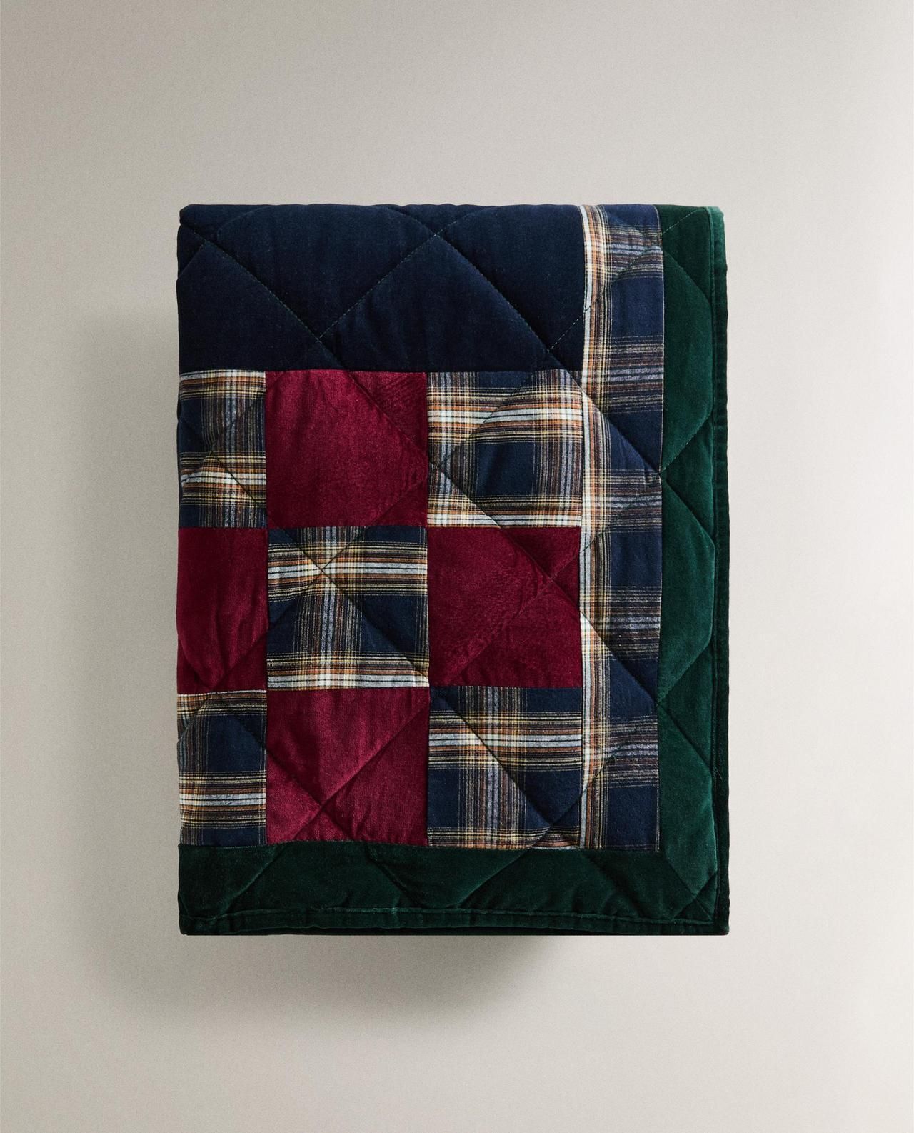 Одеяло изготовлено из сшитых между собой кусочков разных тканей, образующих геометрический узор в клетку. Преобладающие цвета-темно-красный, темно-синий, темно-зеленый и клетчатый узор в бежевых, синих и коричневых тонах.