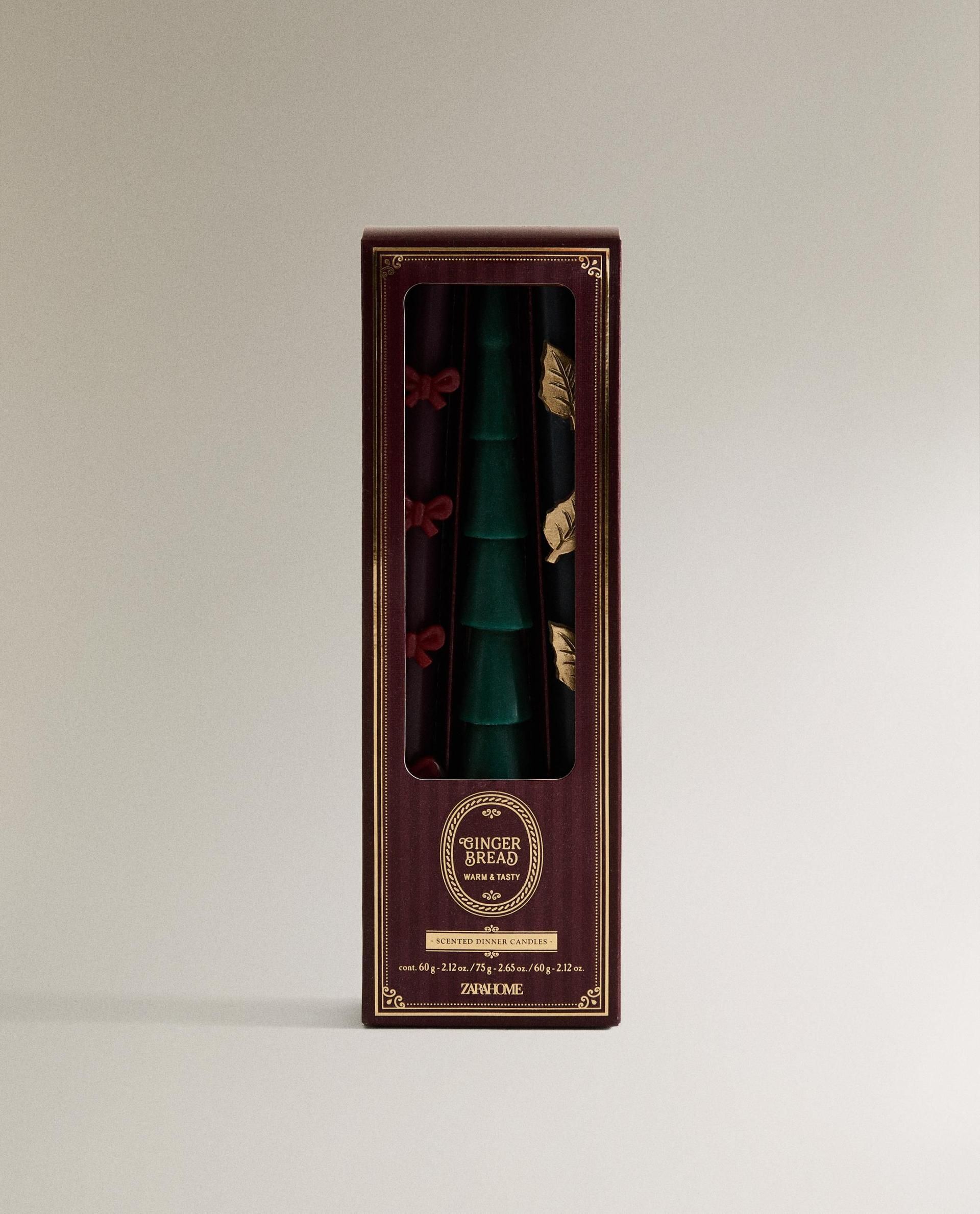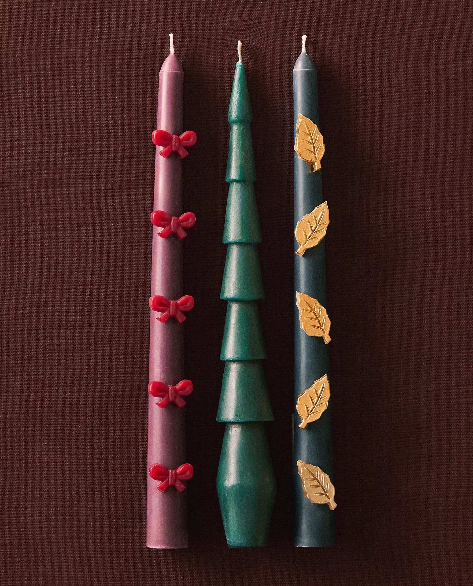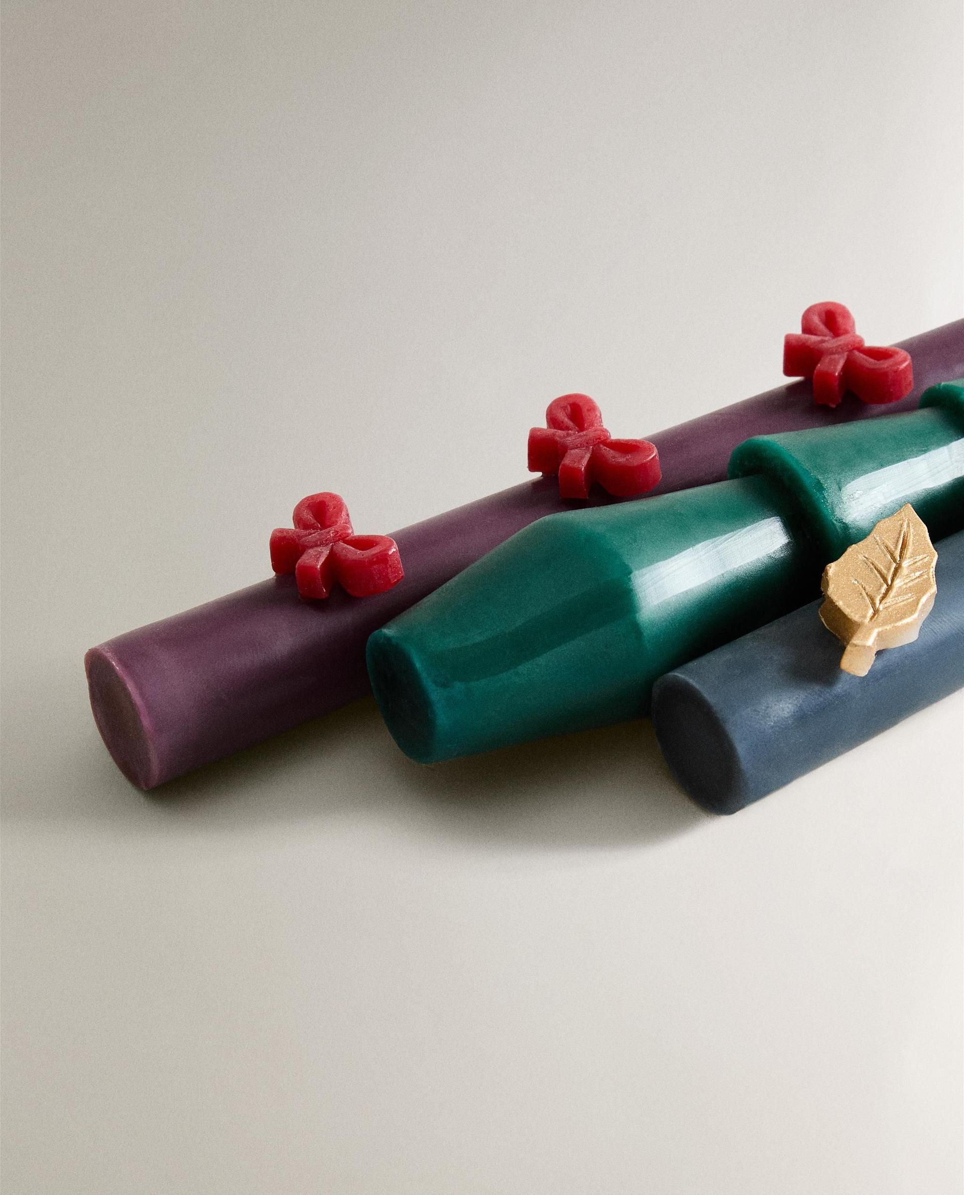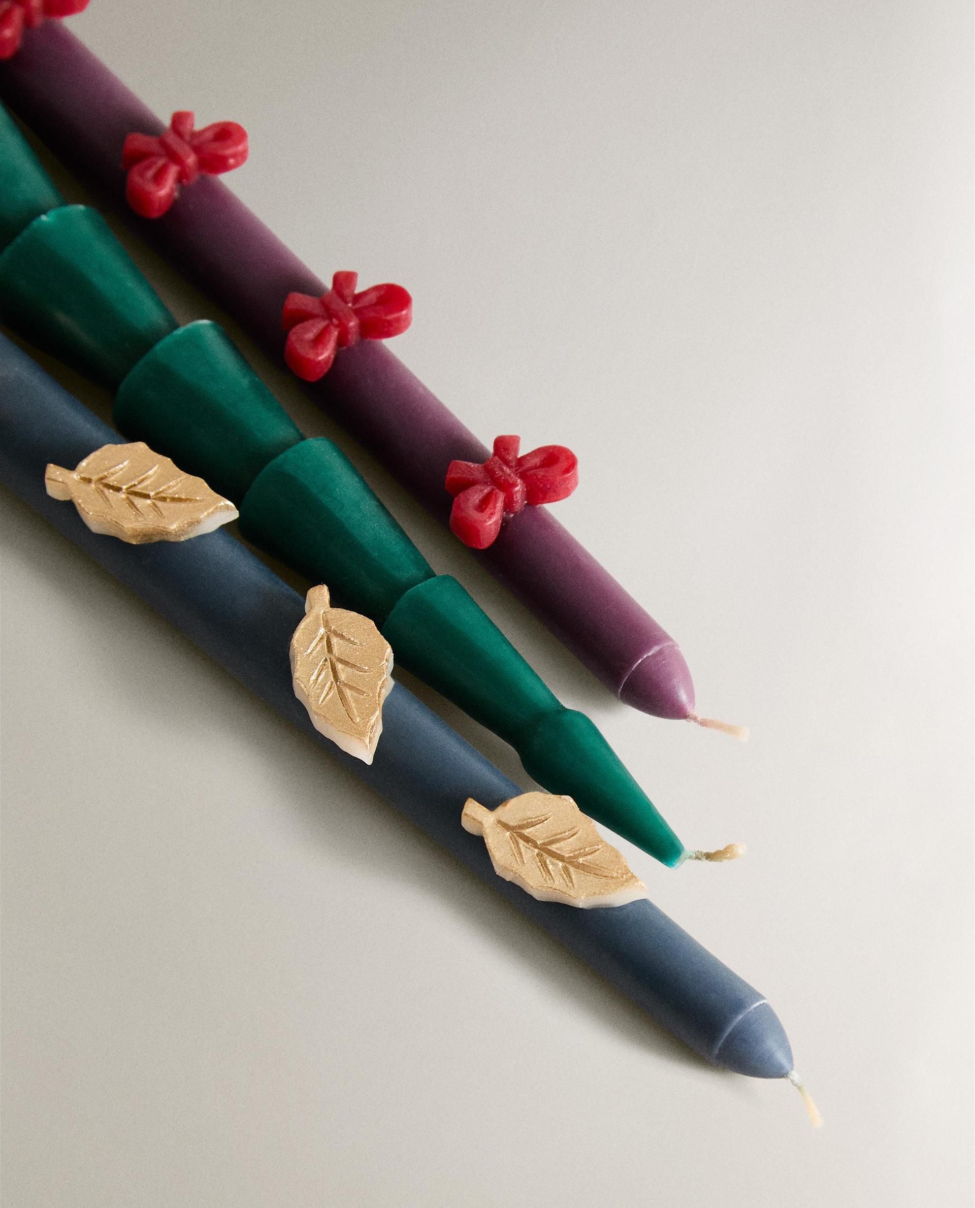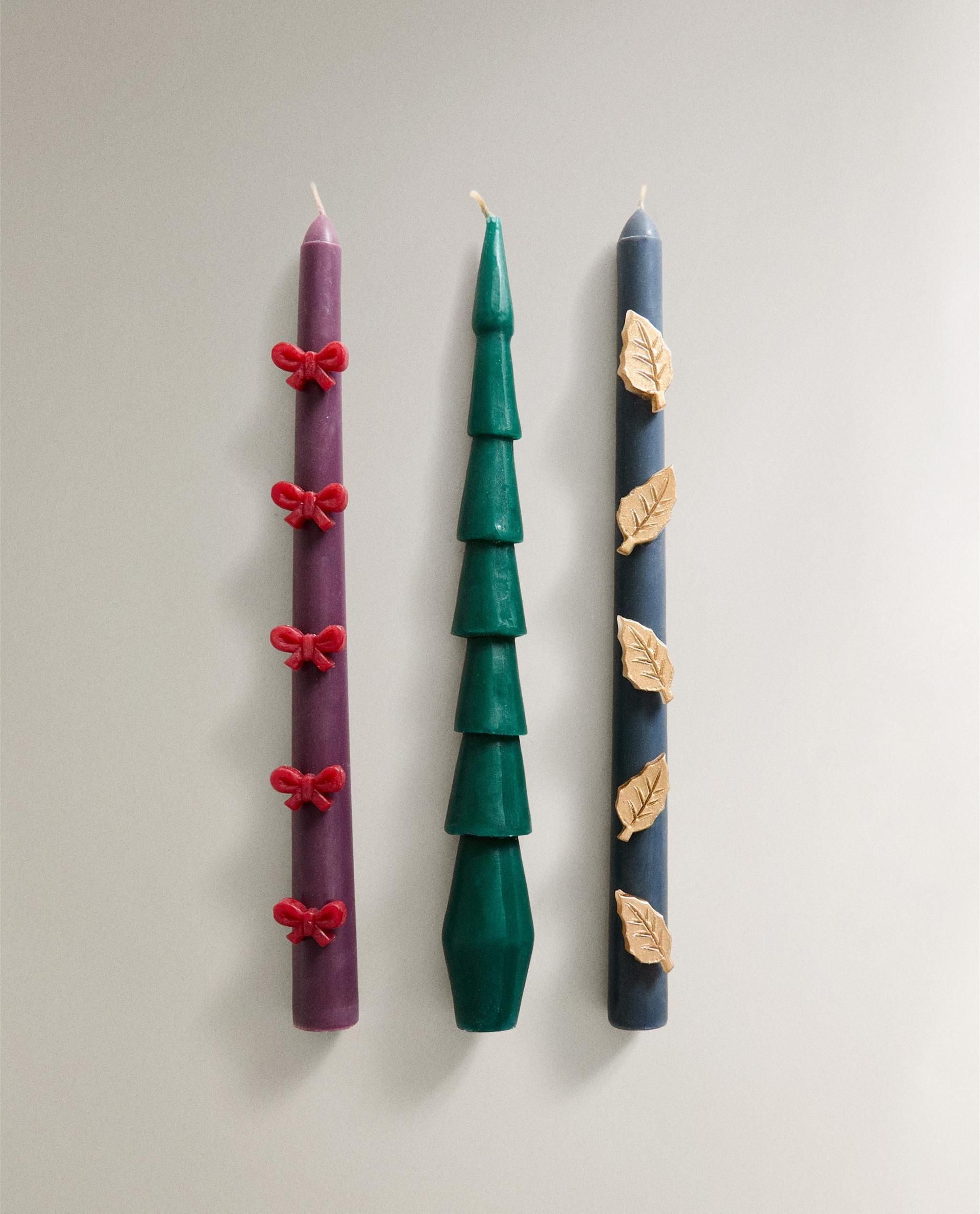 Ароматические свечи удлиненной формы с различными рождественскими украшениями.