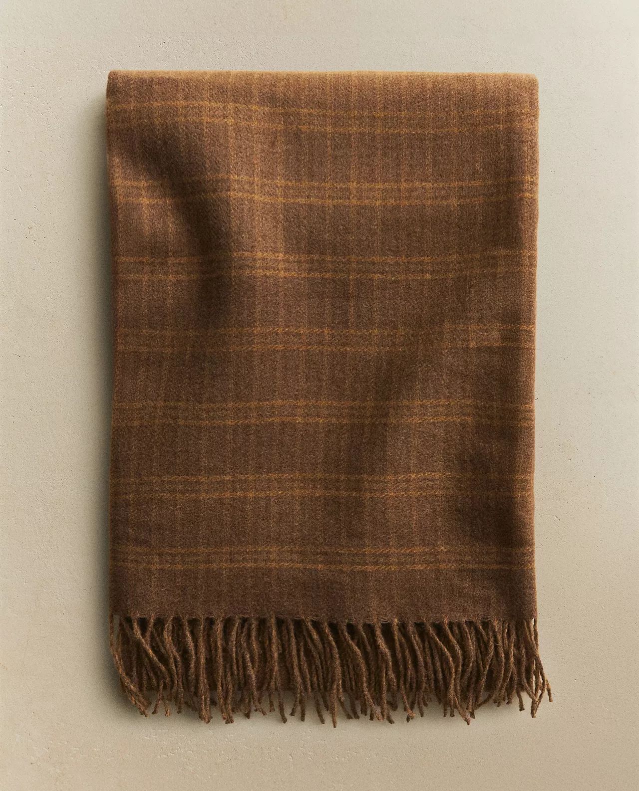 Двухстороннее клетчатое декоративное одеяло с бахромой на концах.