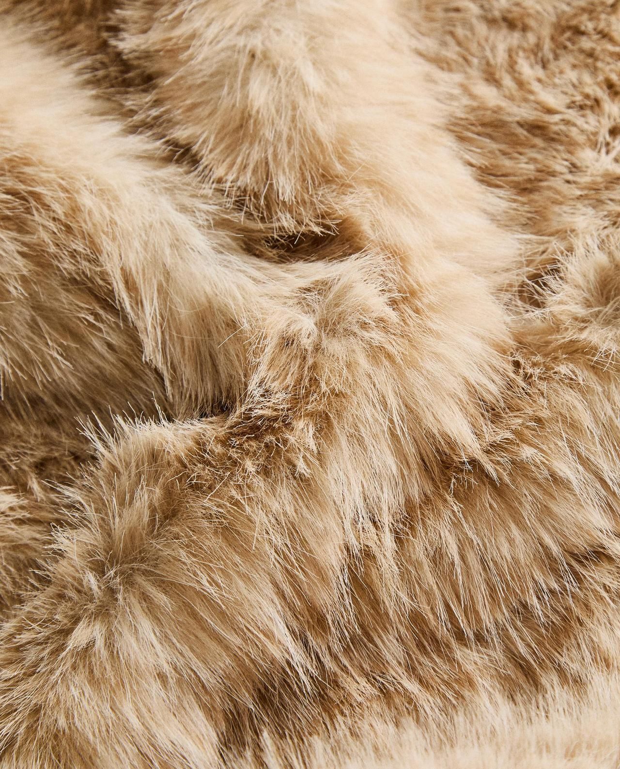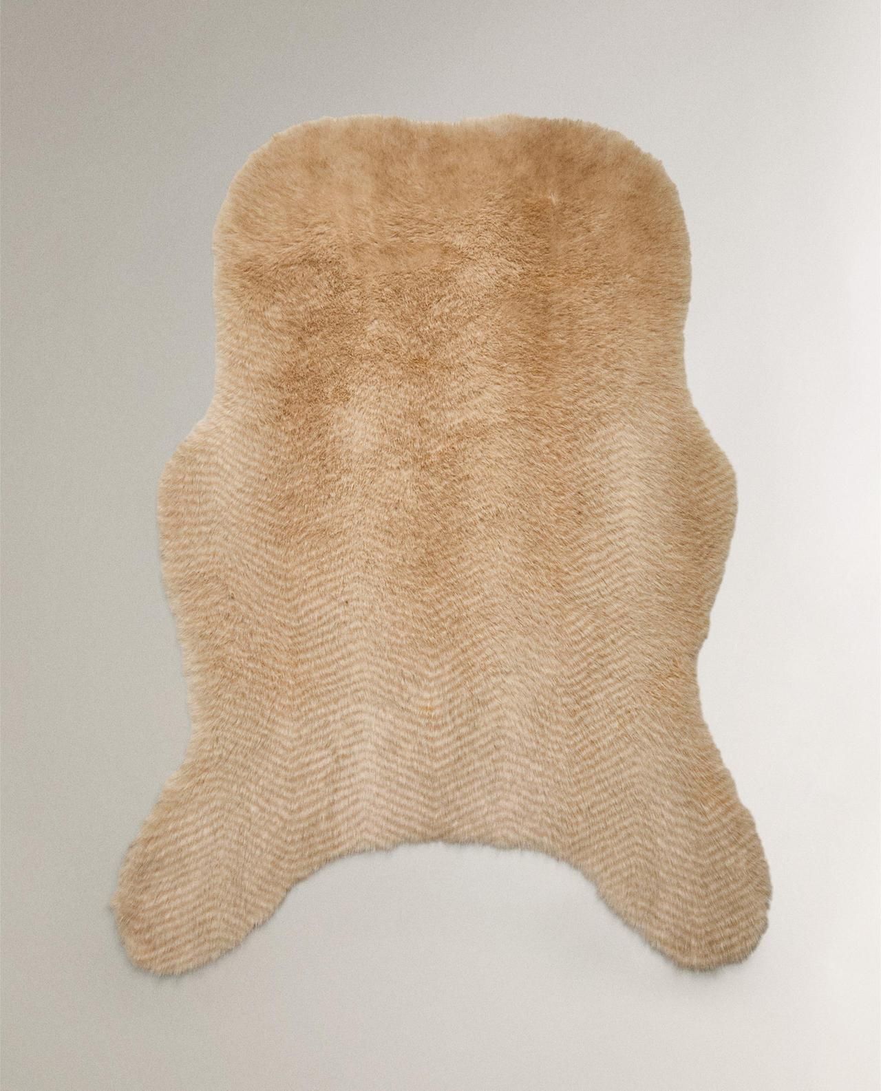 Одеяло бежевого цвета, с эффектом очень мягкого меха. Изделие имеет неправильную форму, что придает ему уникальный и оригинальный дизайн.
