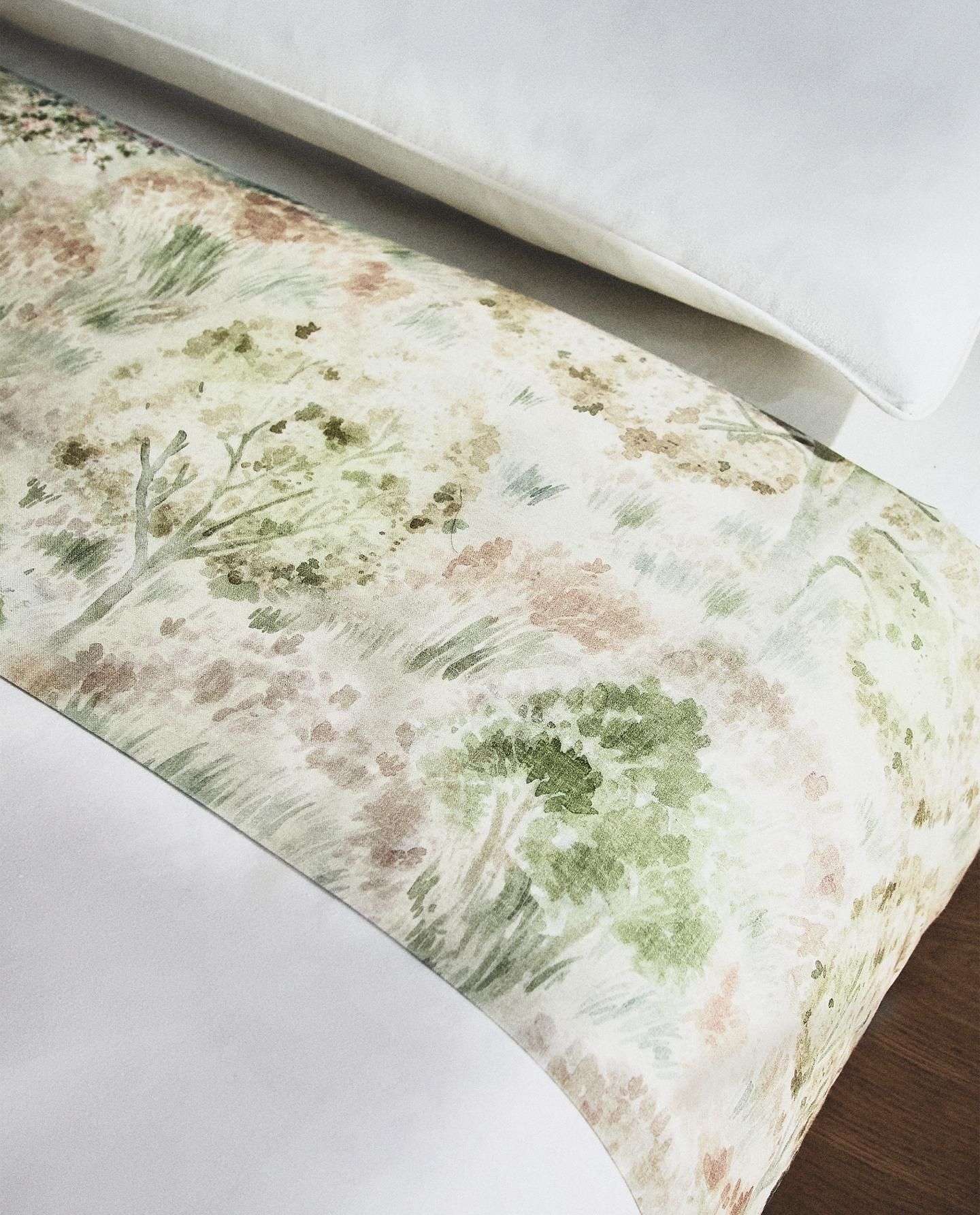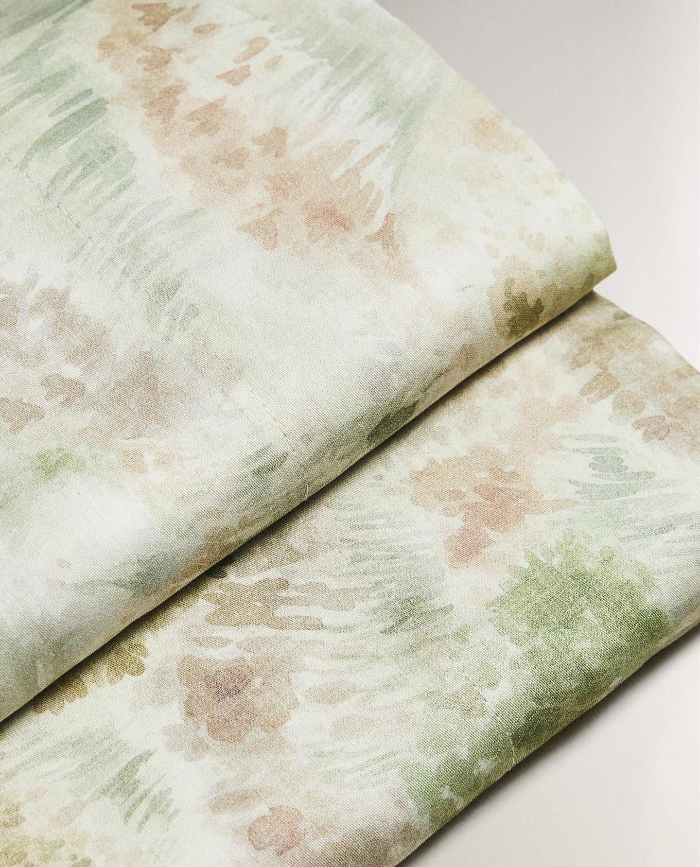 Верхняя простыня из атласа весом 200 нитей, с принтом в садовых мотивах и эффектом акварели.
