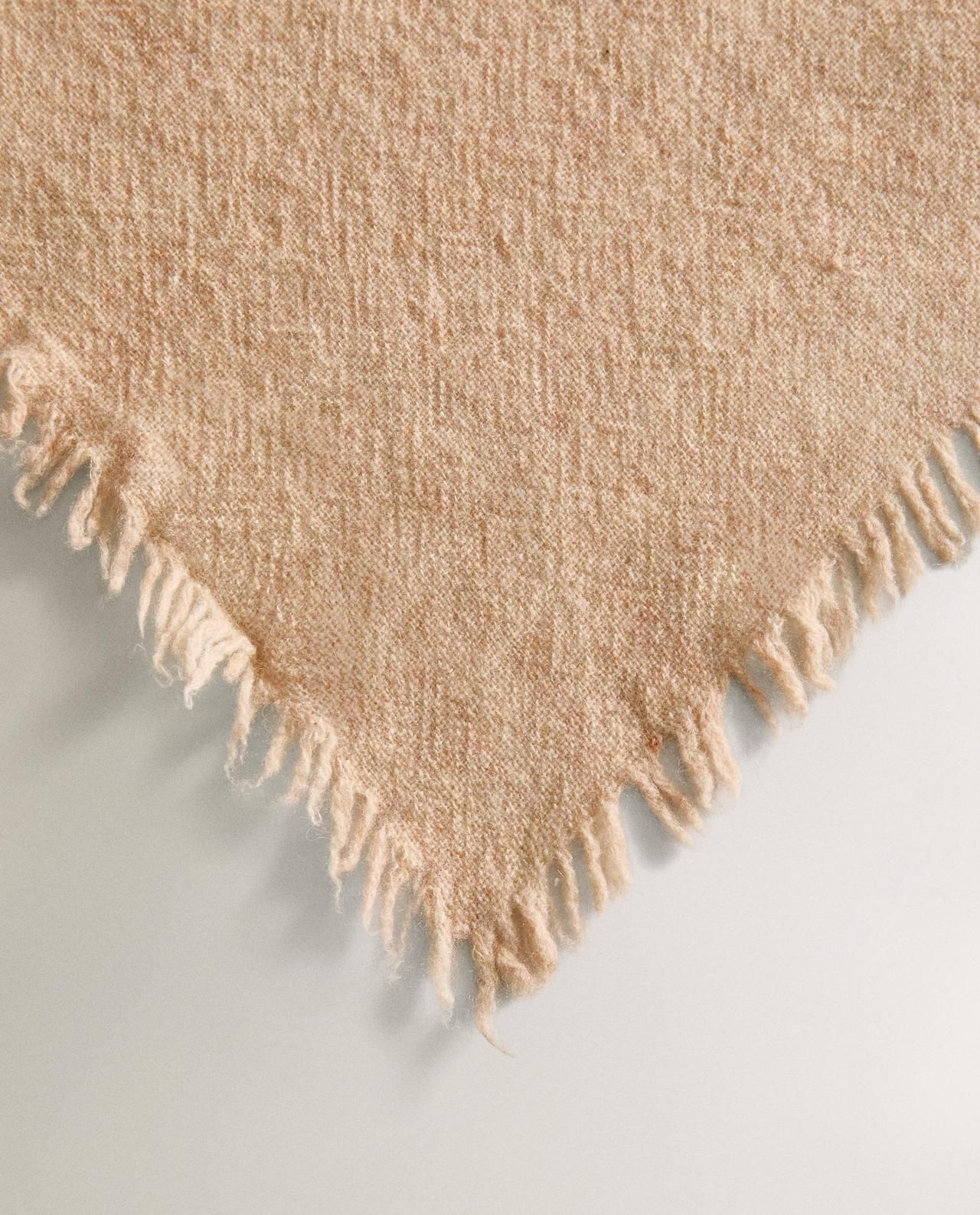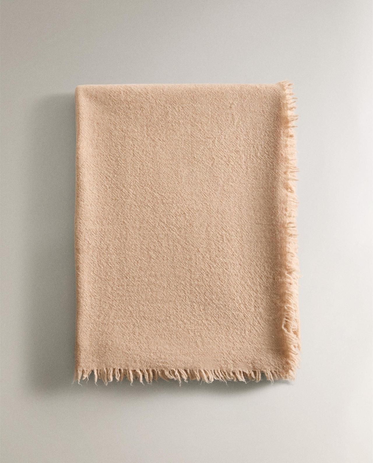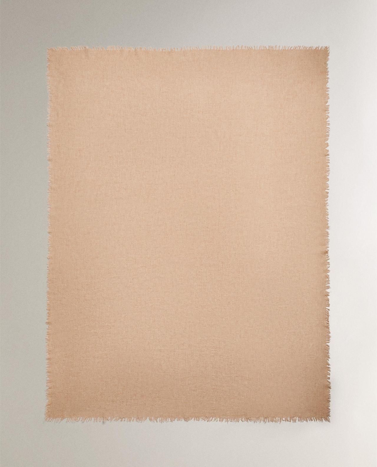 Декоративное одеяло из шерсти, однотонное и отделанное бахромой.