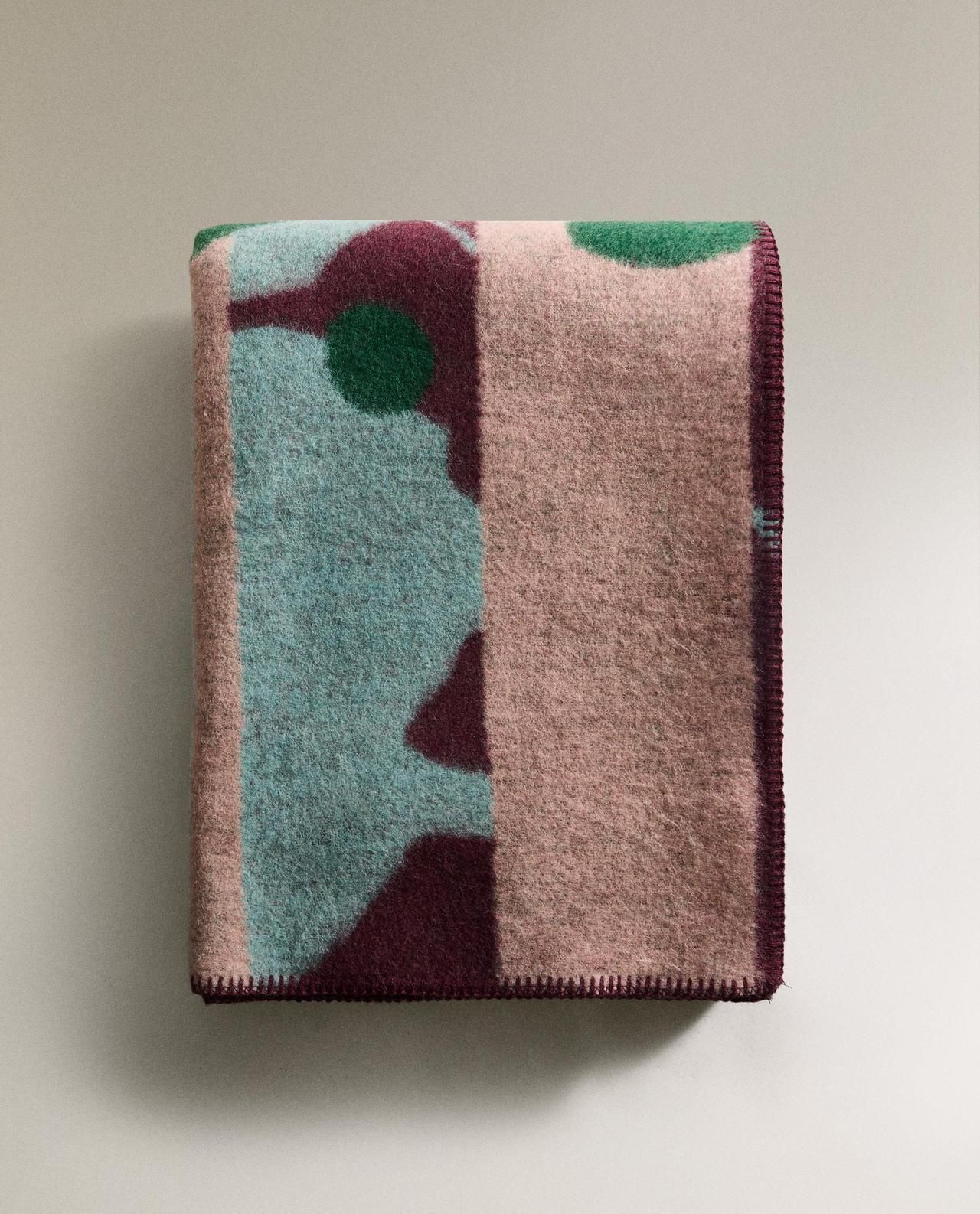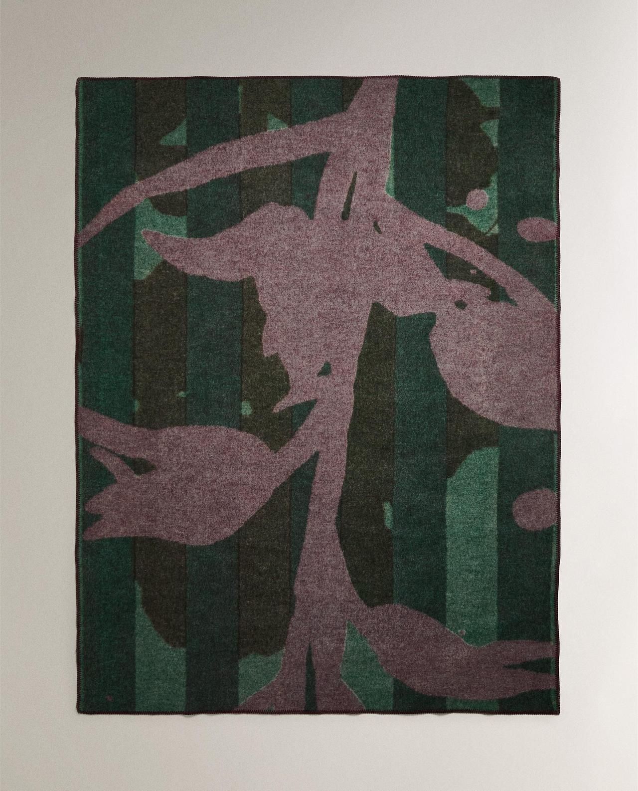 Одеяло из полосатой шерстяной смеси с контрастным цветным рисунком веток.
