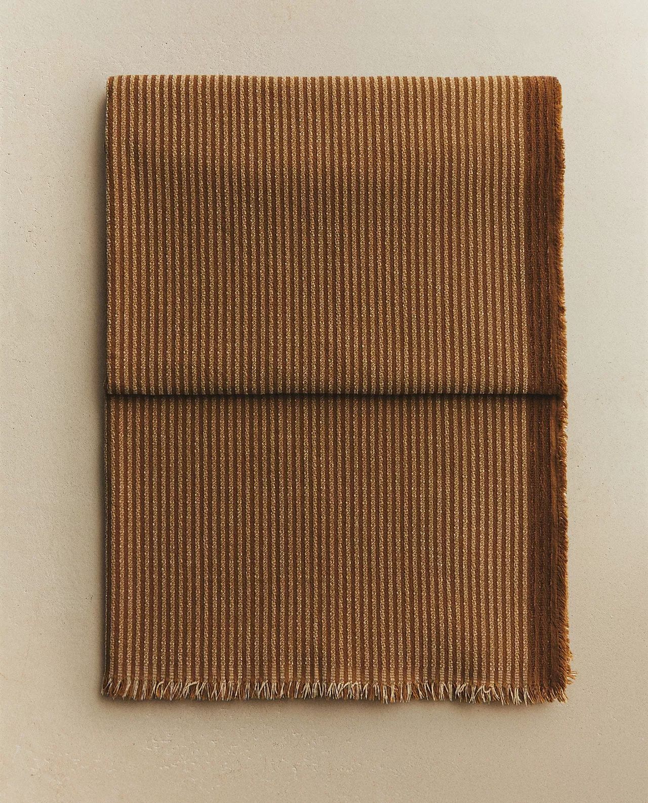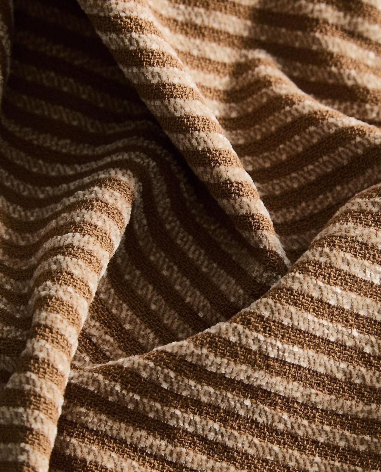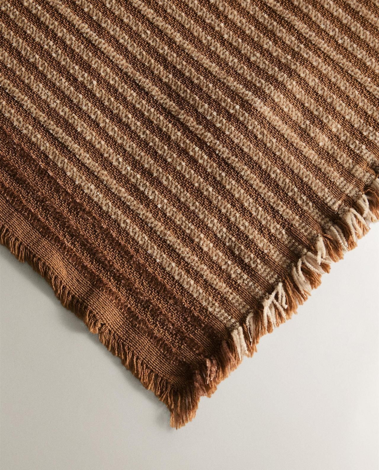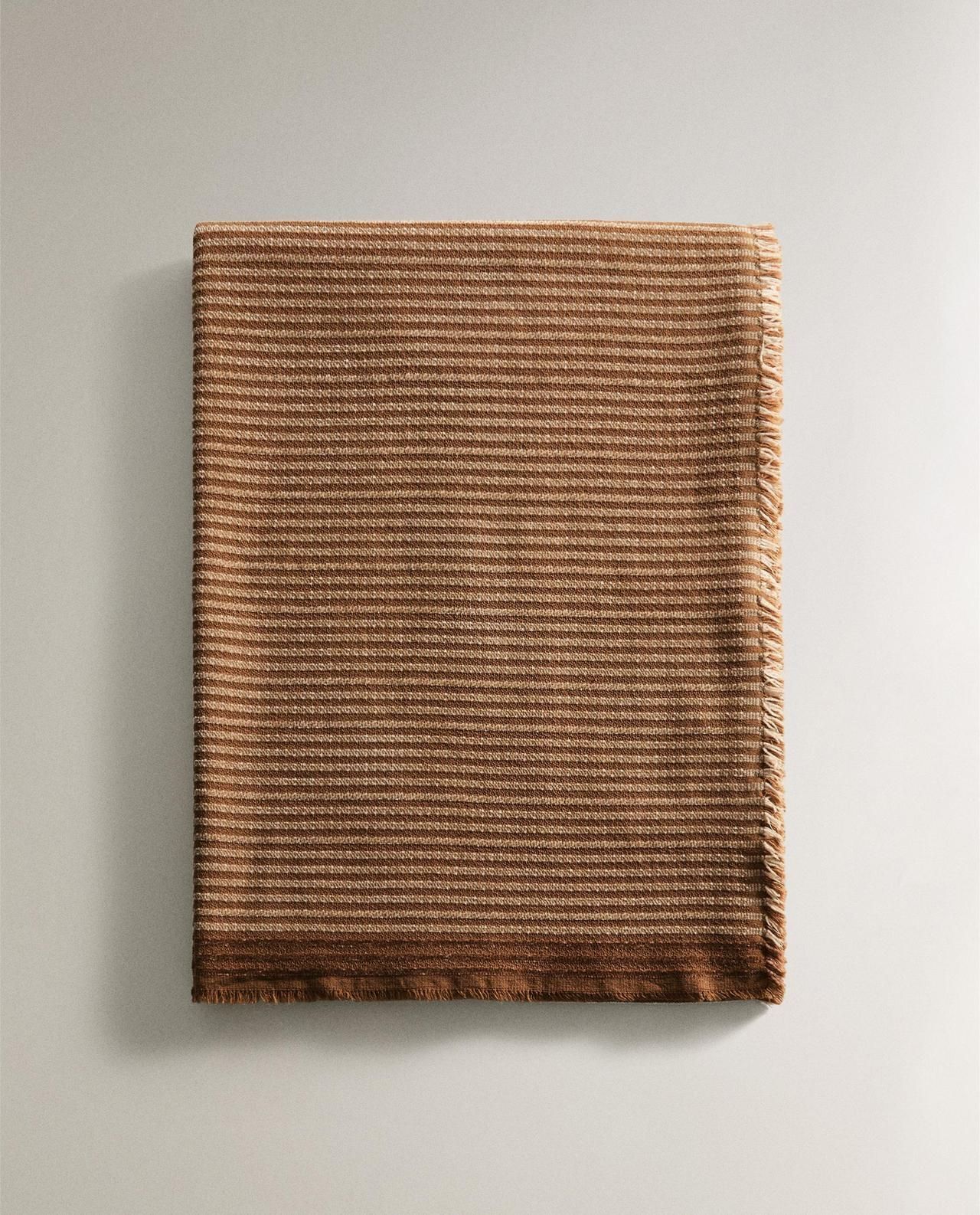 Декоративное полосатое синелевое одеяло, отделанное бахромой.