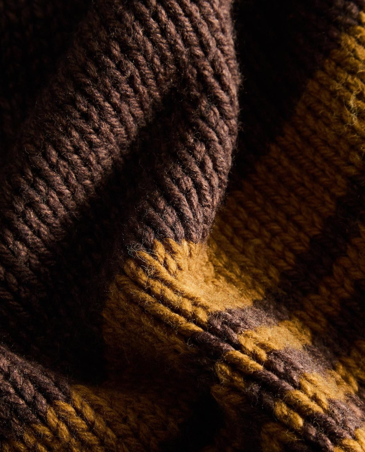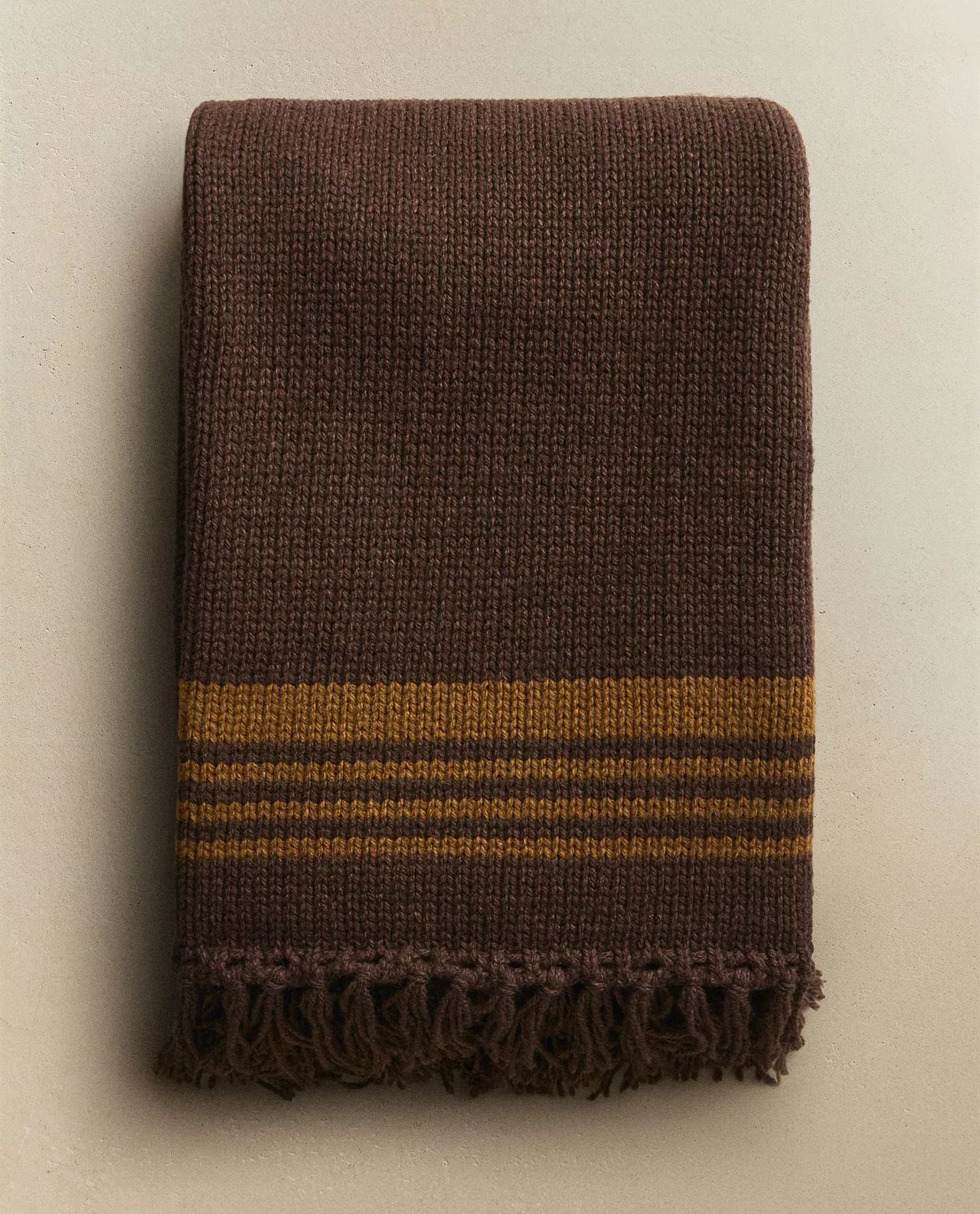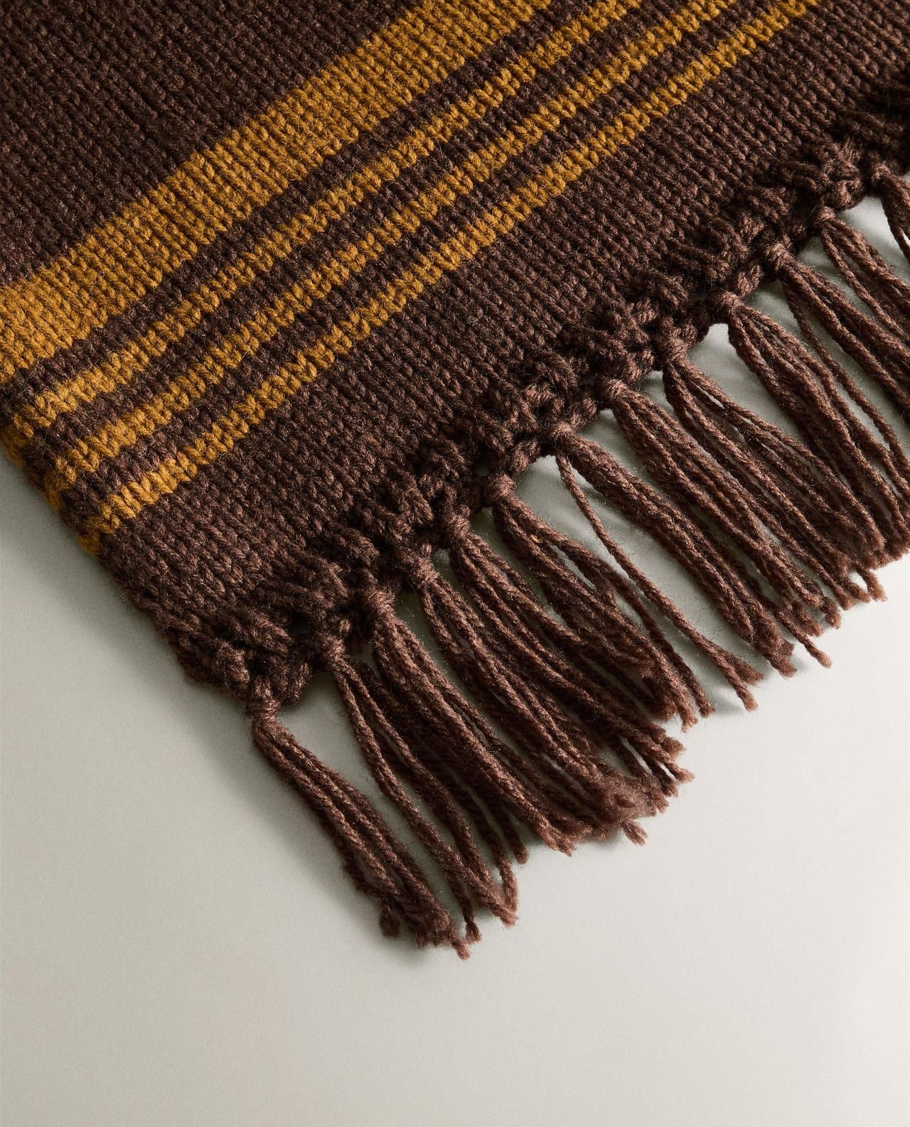 Декоративное вязаное одеяло в контрастные коричневые полосы, отделанное бахромой на концах.