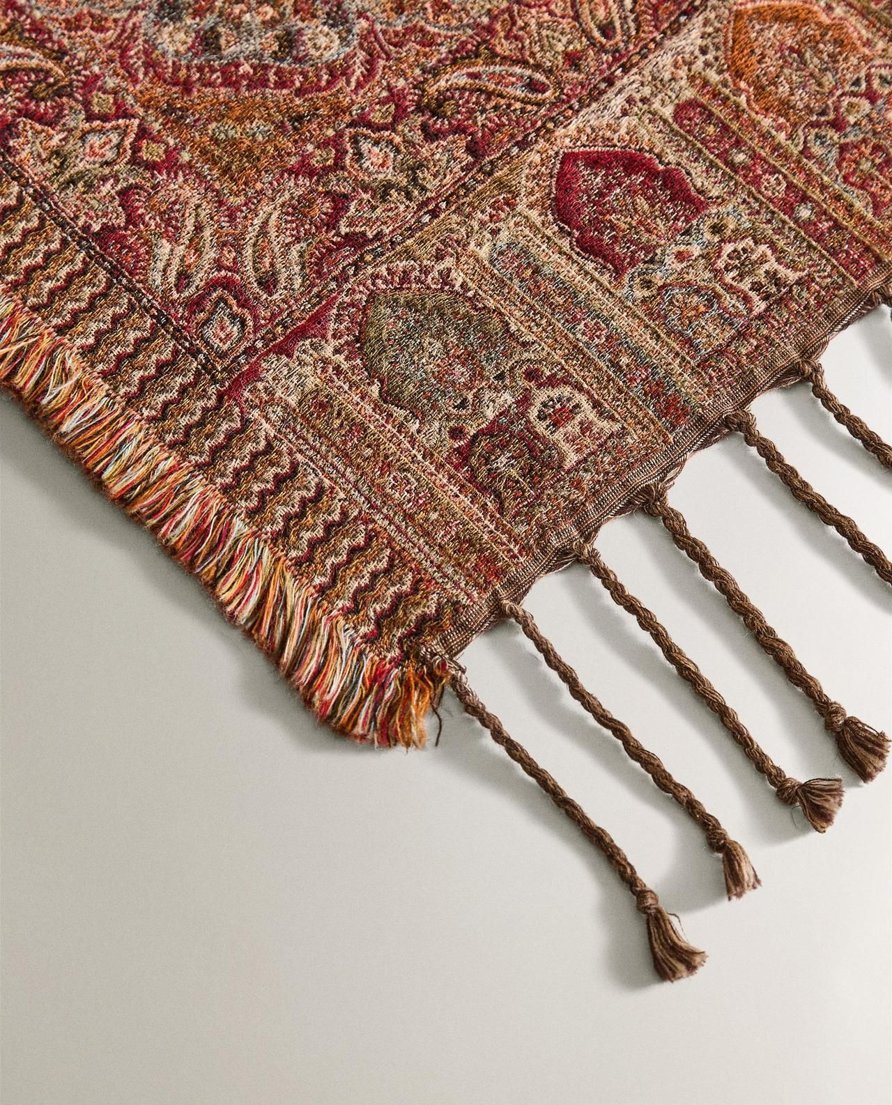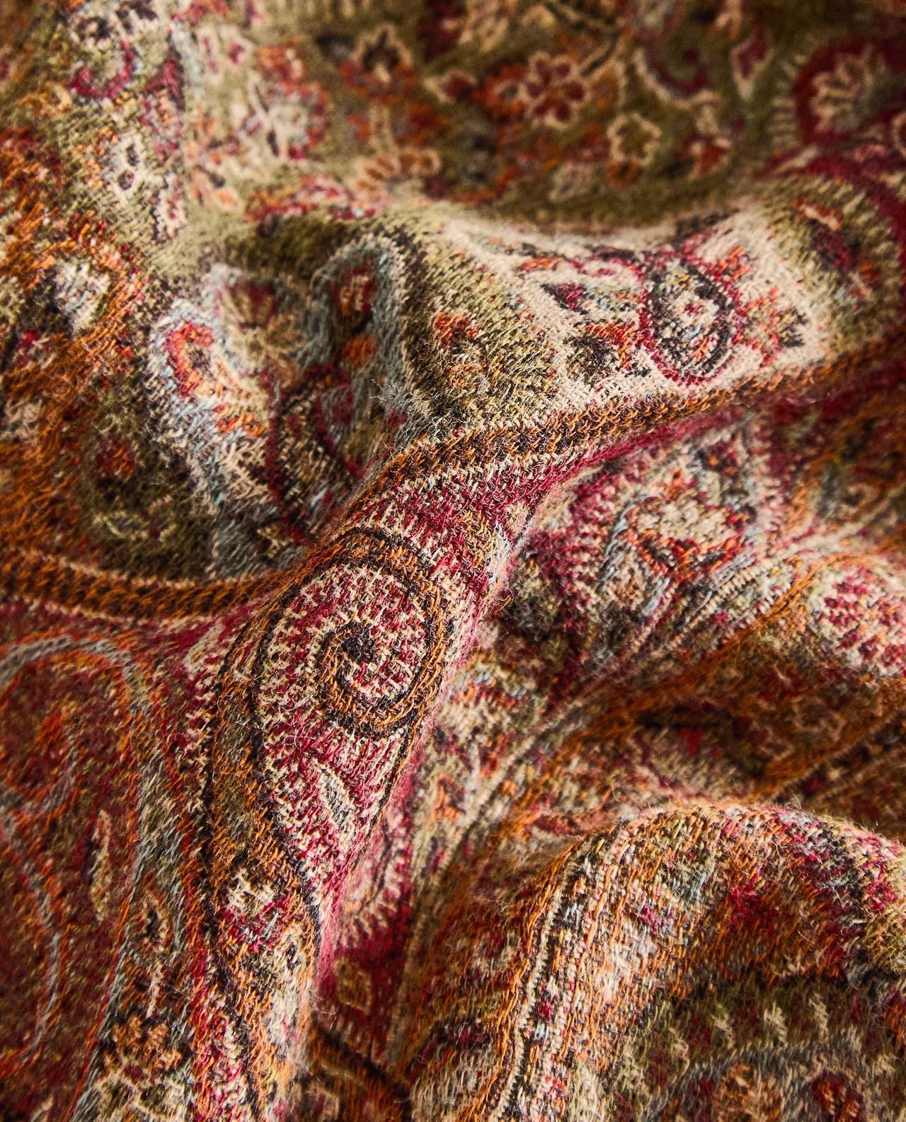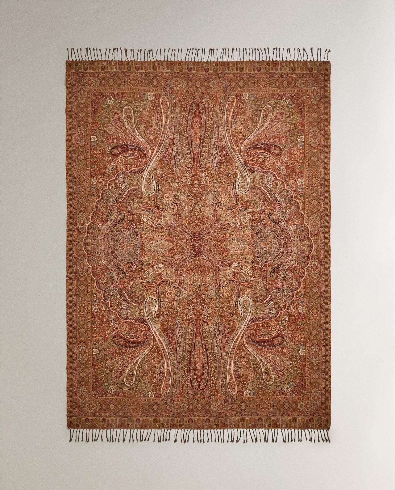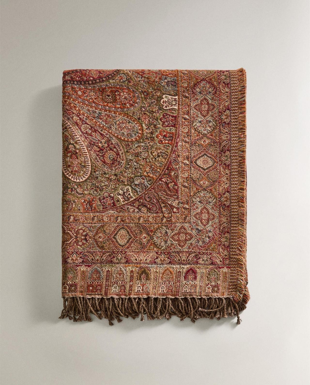 Хлопковое одеяло с бахромой на концах, украшенное рисунком пейсли по всей поверхности.