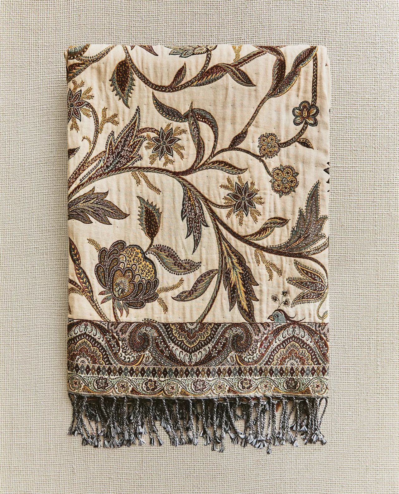 Хлопковое одеяло с бахромой и цветочным принтом.