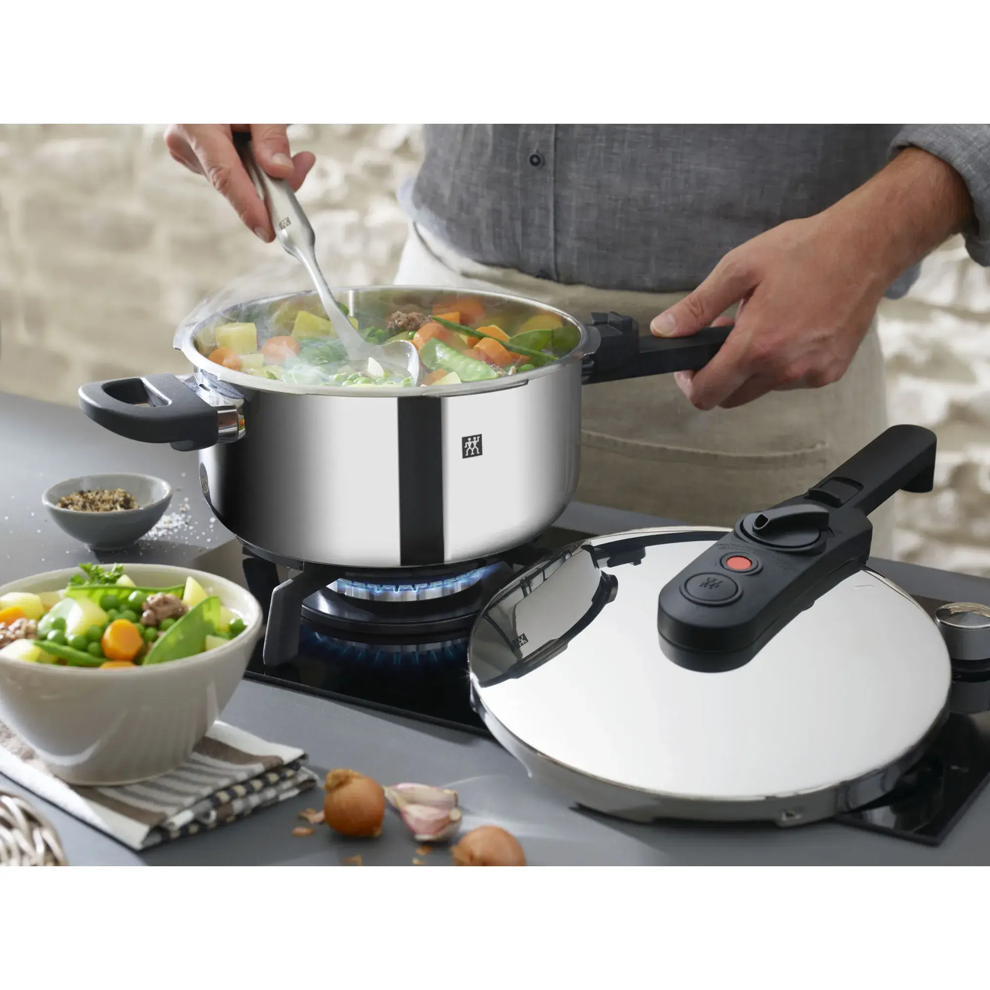 Скороварка EcoQuick II от немецкого бренда Zwilling - незаменимый помощник для всех, кто ценит экономию времени в ежедневных кухонных хлопотах. Инновационная скороварка EcoQuick II позволит вам сократить время приготовления блюд для себя, семьи и друзей. Продукты, приготовленные в скороварке, обладают глубиной вкуса и аромата благодаря тому, что готовятся в герметичной емкости. Кроме того, приготовление в скороварке экономит время и энергию. Готовя в скороварке, вы получите более ароматную пищу, а ее цвет будет более ярким и насыщенным. Используя скороварку, вы сможете быстрее поднять температуру внутри кастрюли, тем самым сэкономив энергию и время приготовления на 70 %.