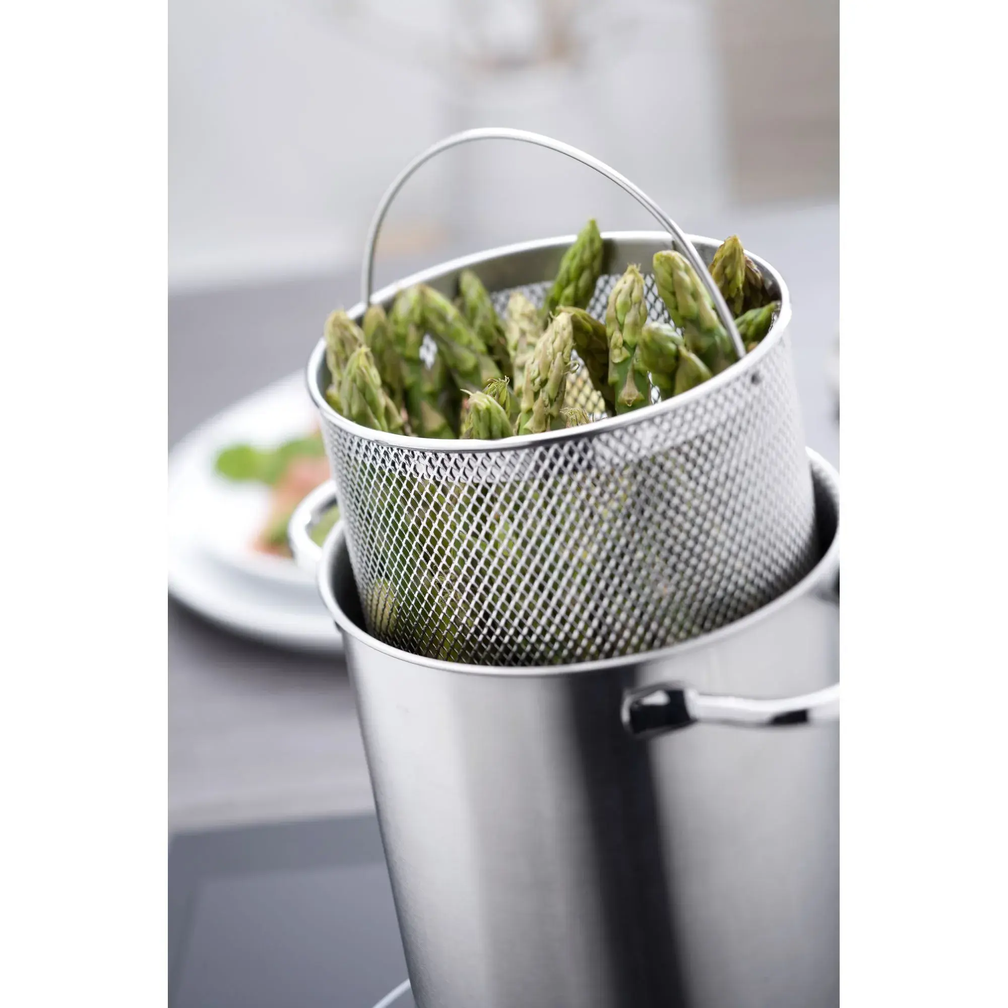 Внутри кастрюли вы также найдете выдвижную корзину из нержавеющей стали. Корзина позволяет быстро вынимать и одновременно процеживать содержимое кастрюли.
